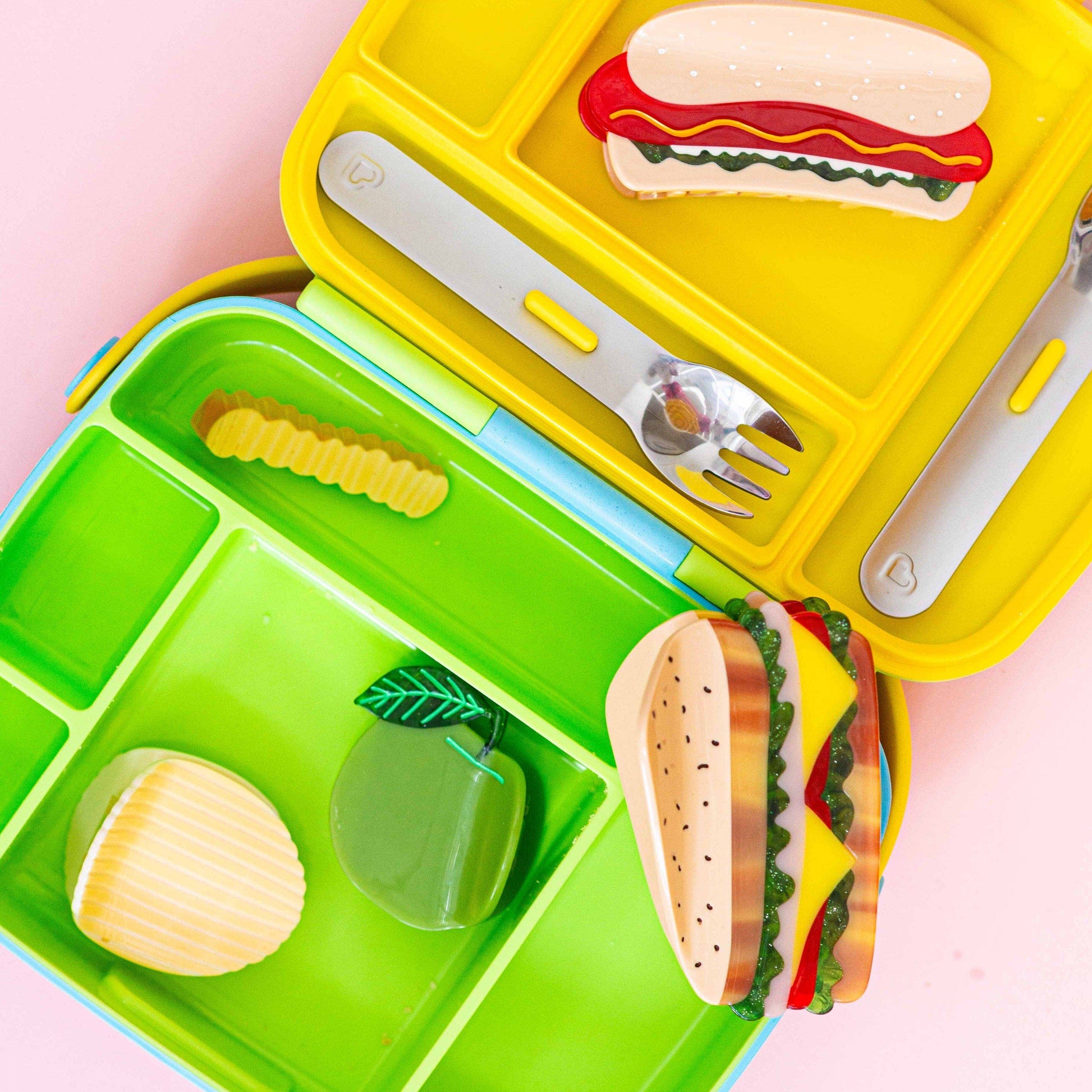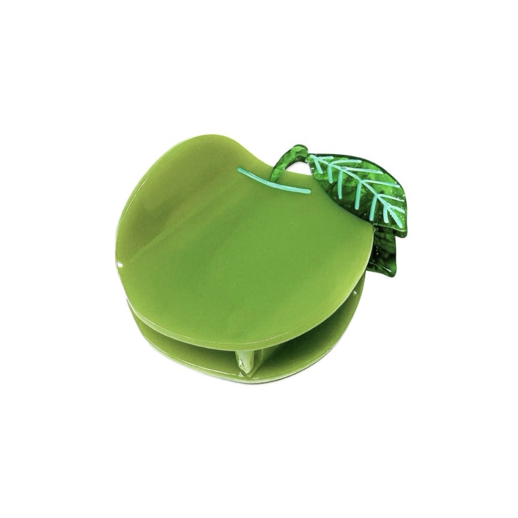 hand-painted 2.25” green apple hair claw clip (so brat!) • made from cellulose acetate, a plant-based and biodegradable alternative to plastic! • designed in San Francisco, California by Jenny Lemons • ethically produced in China.
