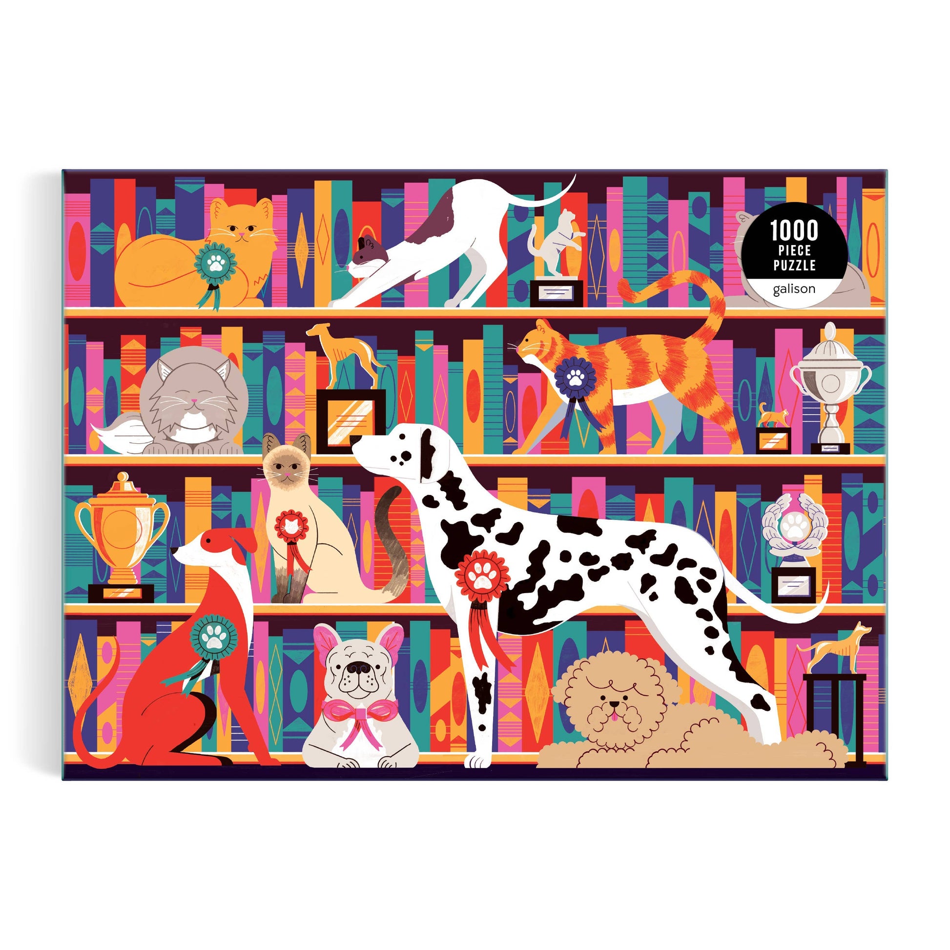 Best in Show 1000 Piece Puzzle is a witty shelfie of prize-winning cats and dogs sharing a colorful display of trophies and books.