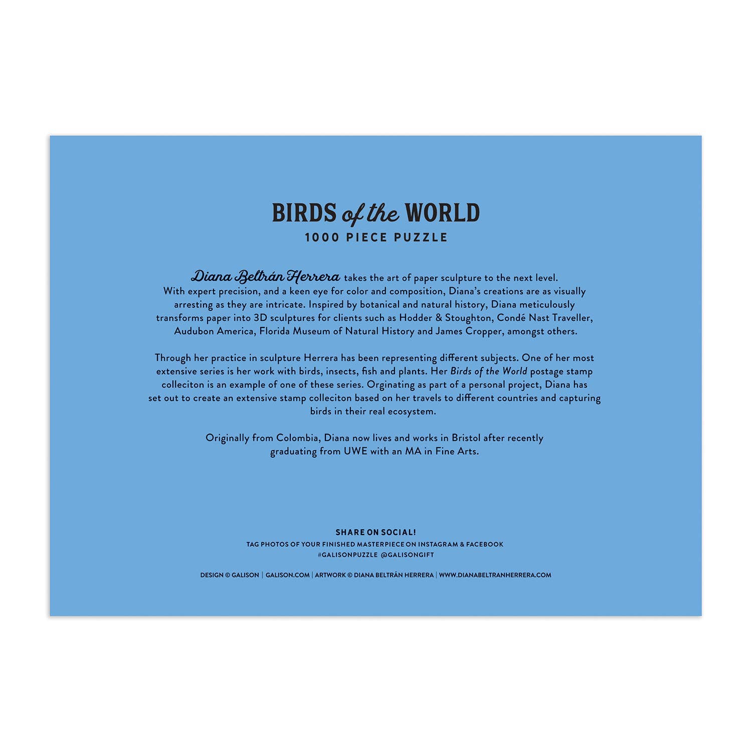 The Birds of the World 1000 Piece Puzzle from Galison features the colorful botanical paper sculptures of Colombian paper artist and sculptor, Diana Beltrán Herrera. 15 intricate bird paper scrulptures their country are shown on postage stamps. Galison puzzles are packaged in matte-finish sturdy boxes, perfect for gifting, reuse, and storage.
