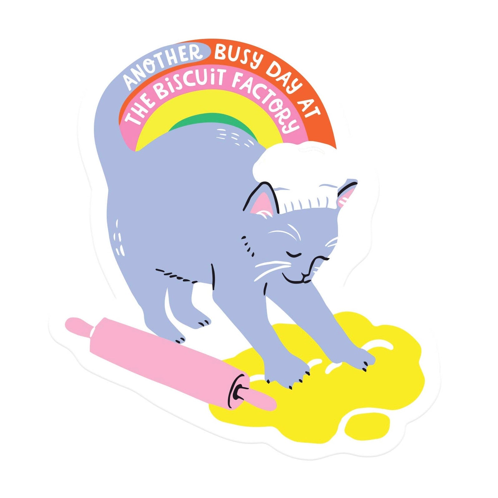 Another busy day at the biscuit factory! It's a hard job but someone's gotta do it. This sticker features a hardworking kitty making biscuits and features a clear background. This vinyl sticker is waterproof, so you can stick it anywhere you please. Water bottle, bike helmet, your car, laptop or anywhere else you want! Diecut shape measures approximately 2.3" x 2.6" Please note - due to different computer monitor calibrations, colors may vary slightly when you receive your actual product. ©️2023 MARIA FILAR All artwork listed is original artwork by Maria Filar and may not be copied, duplicated, or sold for commercial use.
