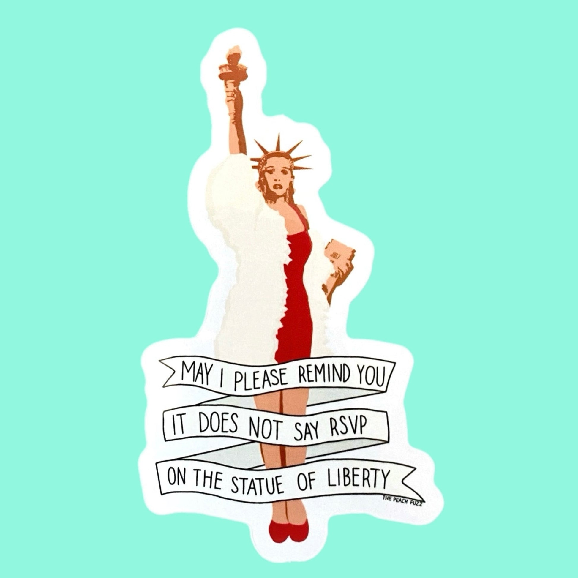 “May I please remind you it does not say RSVP on the Statue of Liberty.” 3” vinyl waterproof sticker