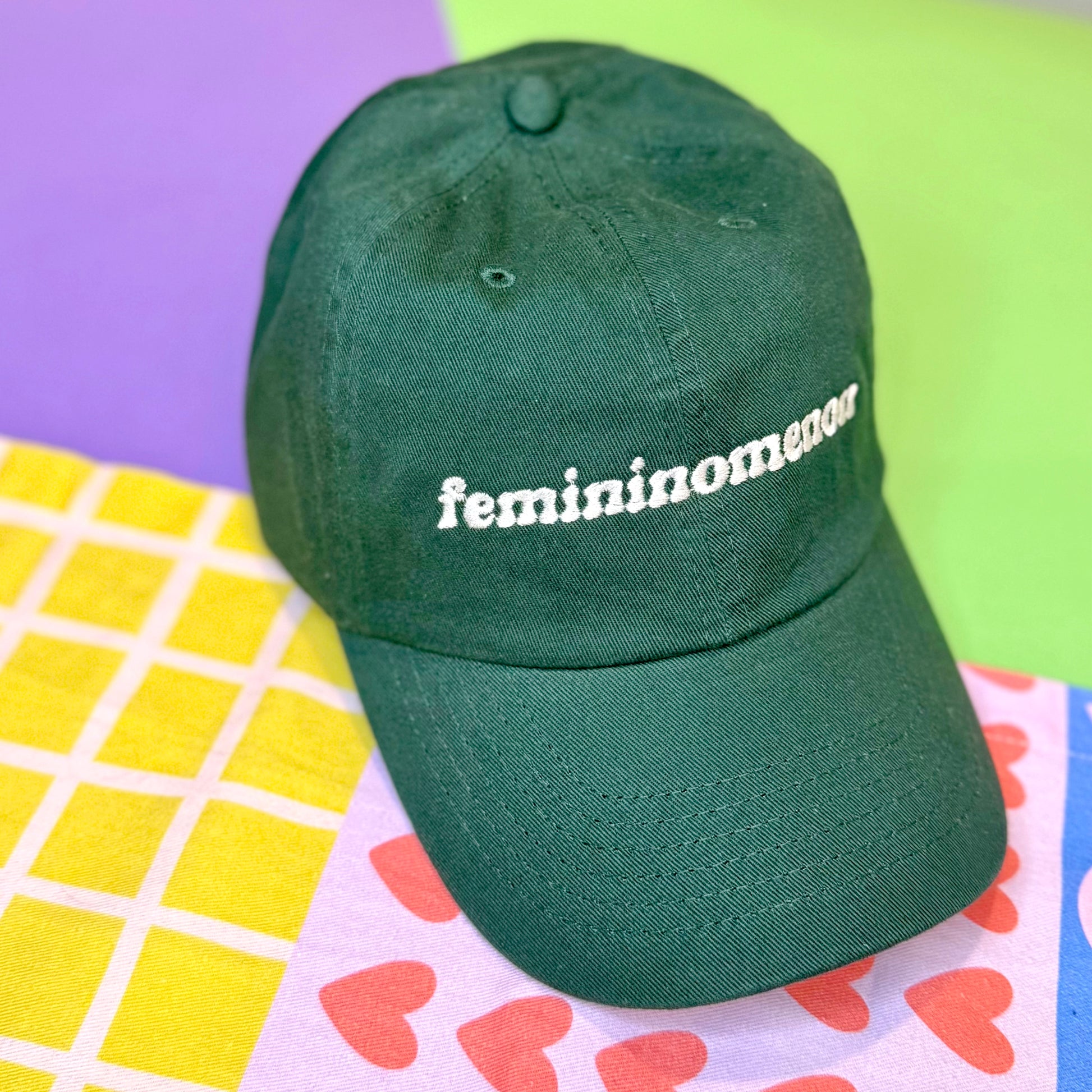 "Femininomenon" machine embroidered on your choice of relaxed fit hat. Brass slider on the back to adjust fit.