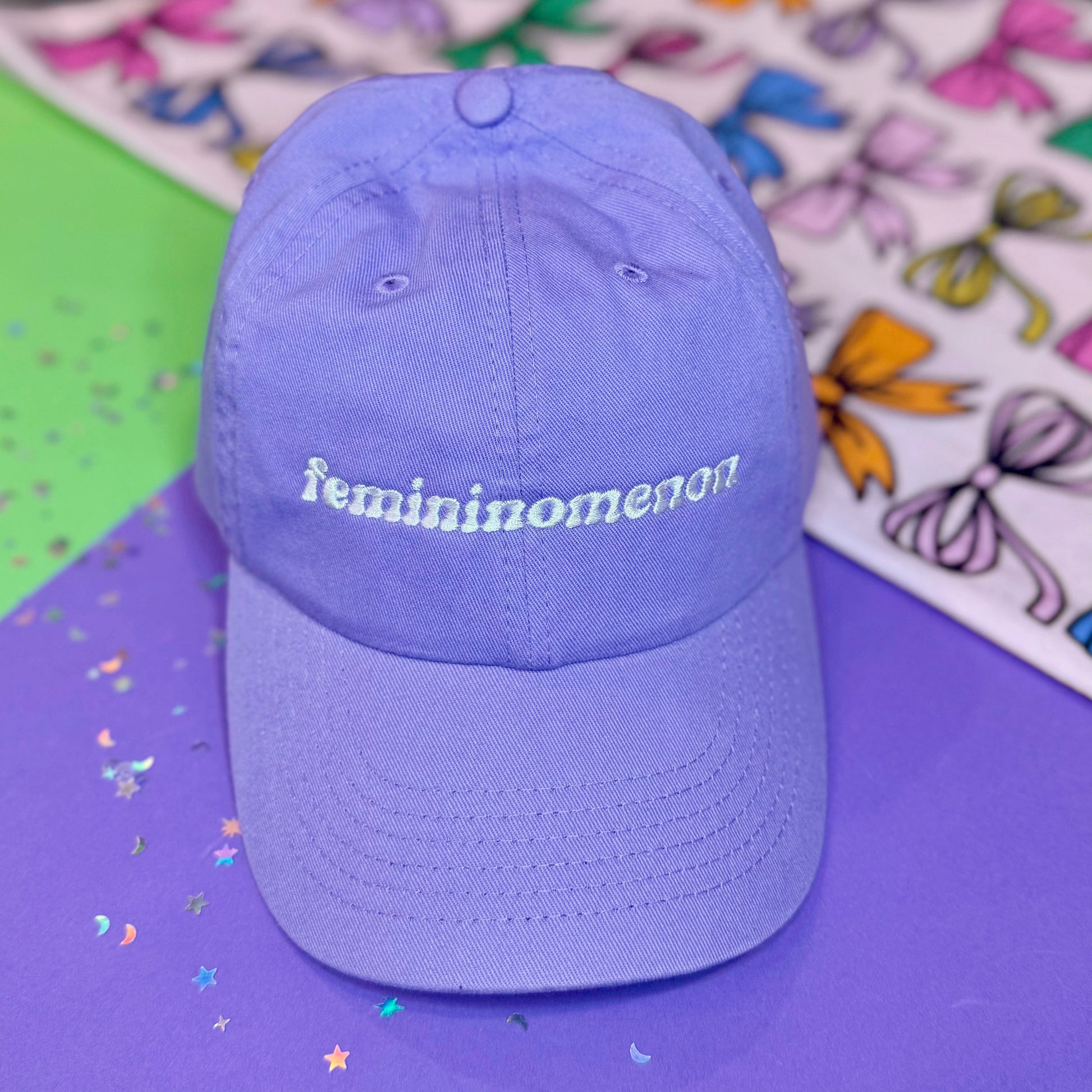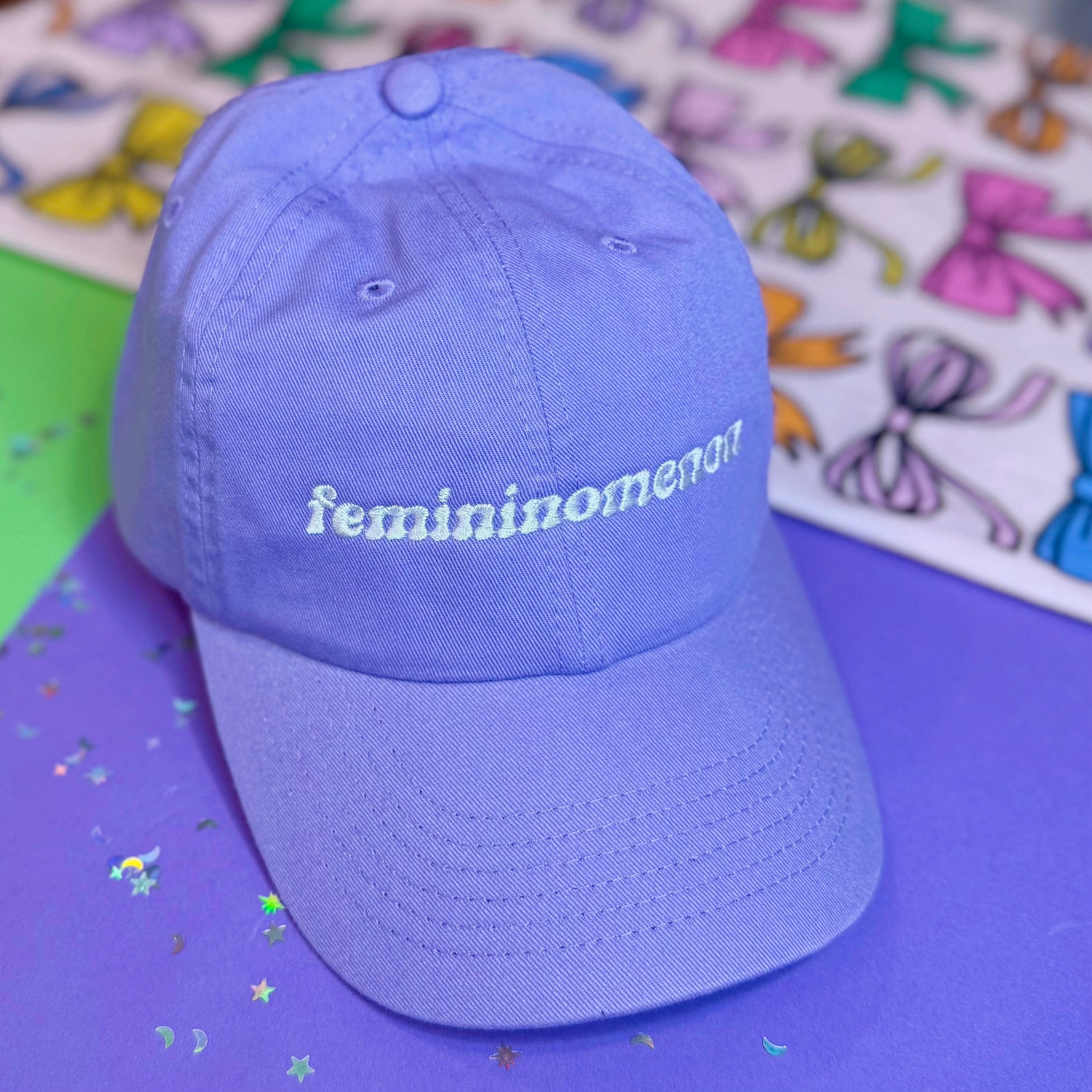 "Femininomenon" machine embroidered on your choice of relaxed fit hat. Brass slider on the back to adjust fit.