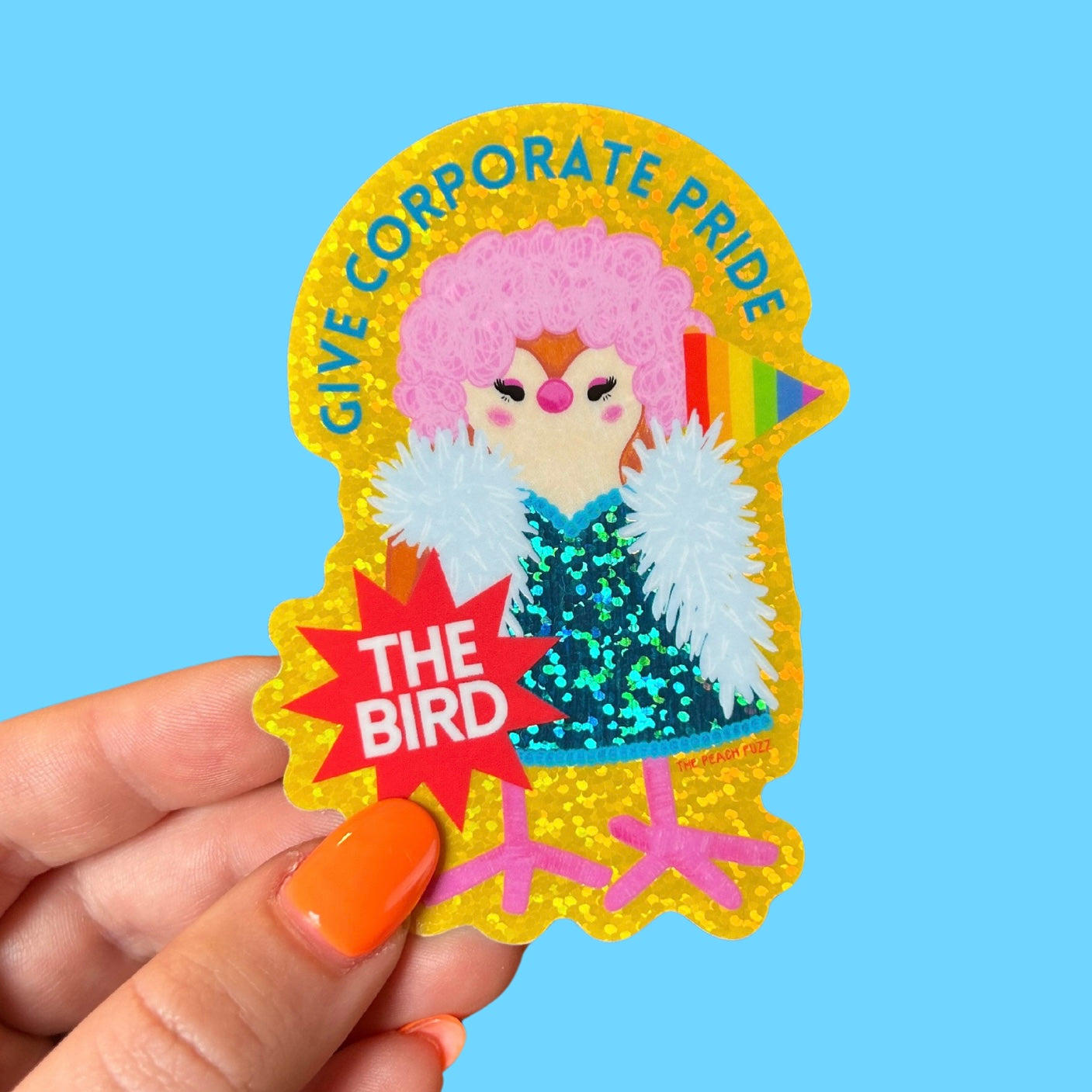 Giving our creative expression over to corporations for pride? Nah, the only thing I'll be giving them any more is the BIRD ;) Sticker measures 3.4 x 2.4 inches and has a glossy finish with glitter details. ✿ fully waterproof ✿ Feature UV screening to protect against weather and sunlight ✿ 2-4 year minimum outdoor life Perfect sticker for your laptop, water bottle, notebook, and even your car!