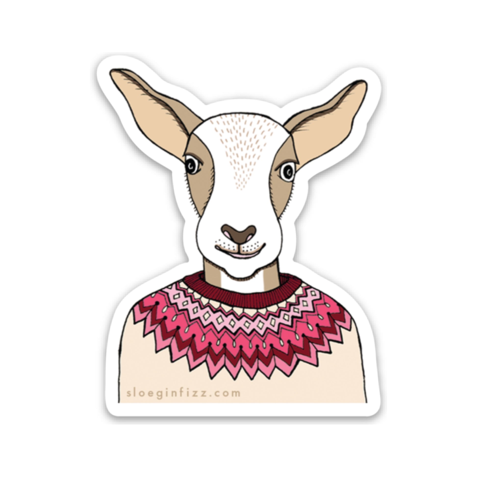 This goat kid loves to show off this hand-knit Fair Isle sweater she made all by herself. 2.16" x 2.74"
