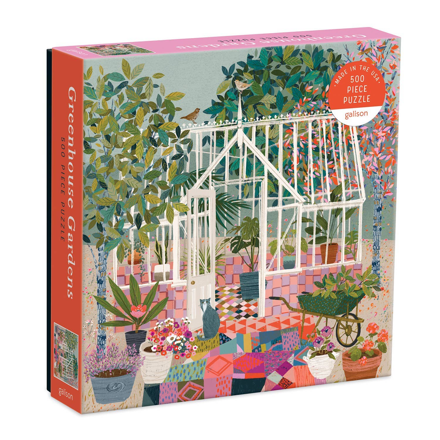 The Greenhouse Gardens 500 Piece Jigsaw Puzzle from Galison features a charming and colorful illustration of a gardener's greenhouse. Galison puzzles are packaged in matte-finish sturdy boxes, perfect for gifting, reuse, and storage.