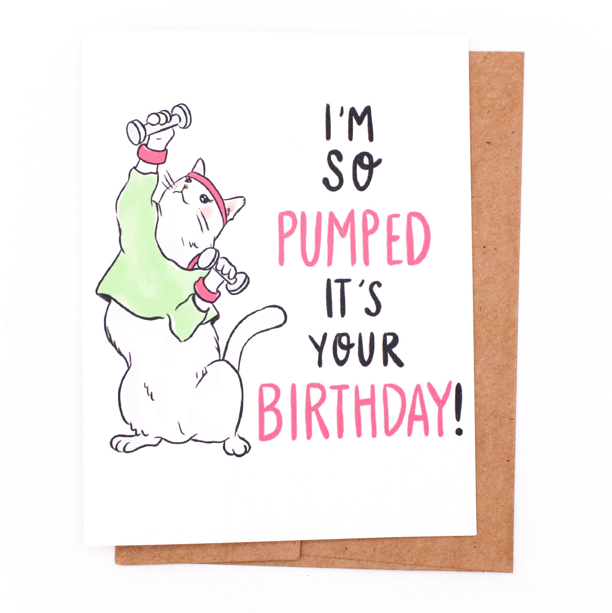 “I’m so pumped it’s your birthday.” Printed in the USA on Fine Art Cardstock. 4.25 x 5.5 A2. Blank inside. Kraft envelope.
