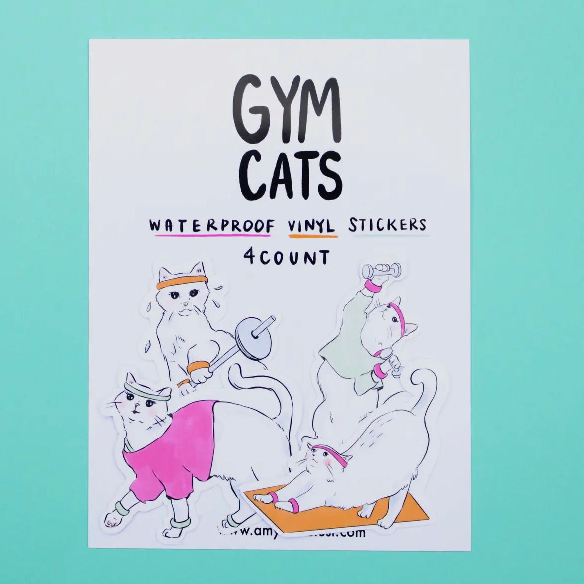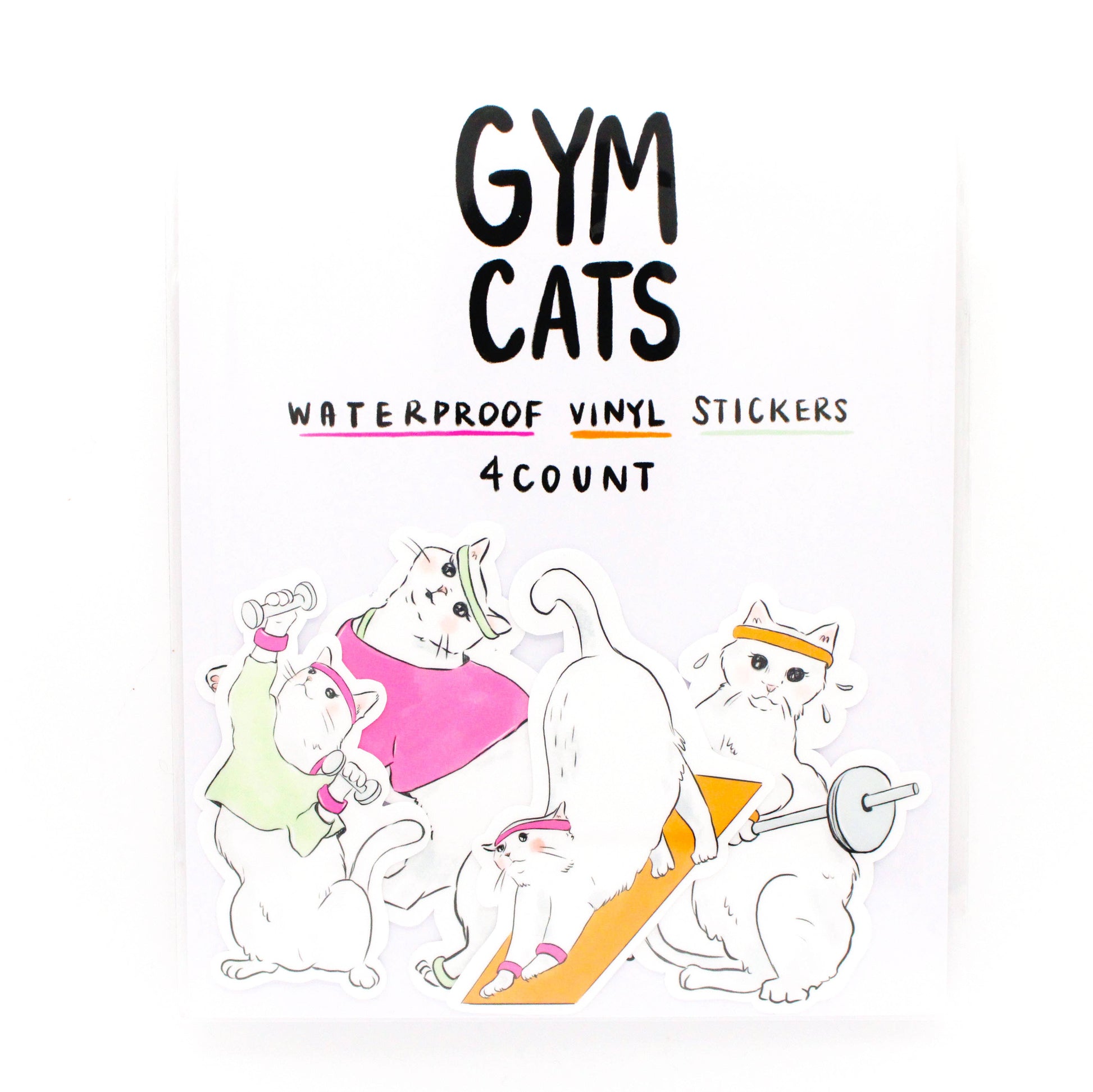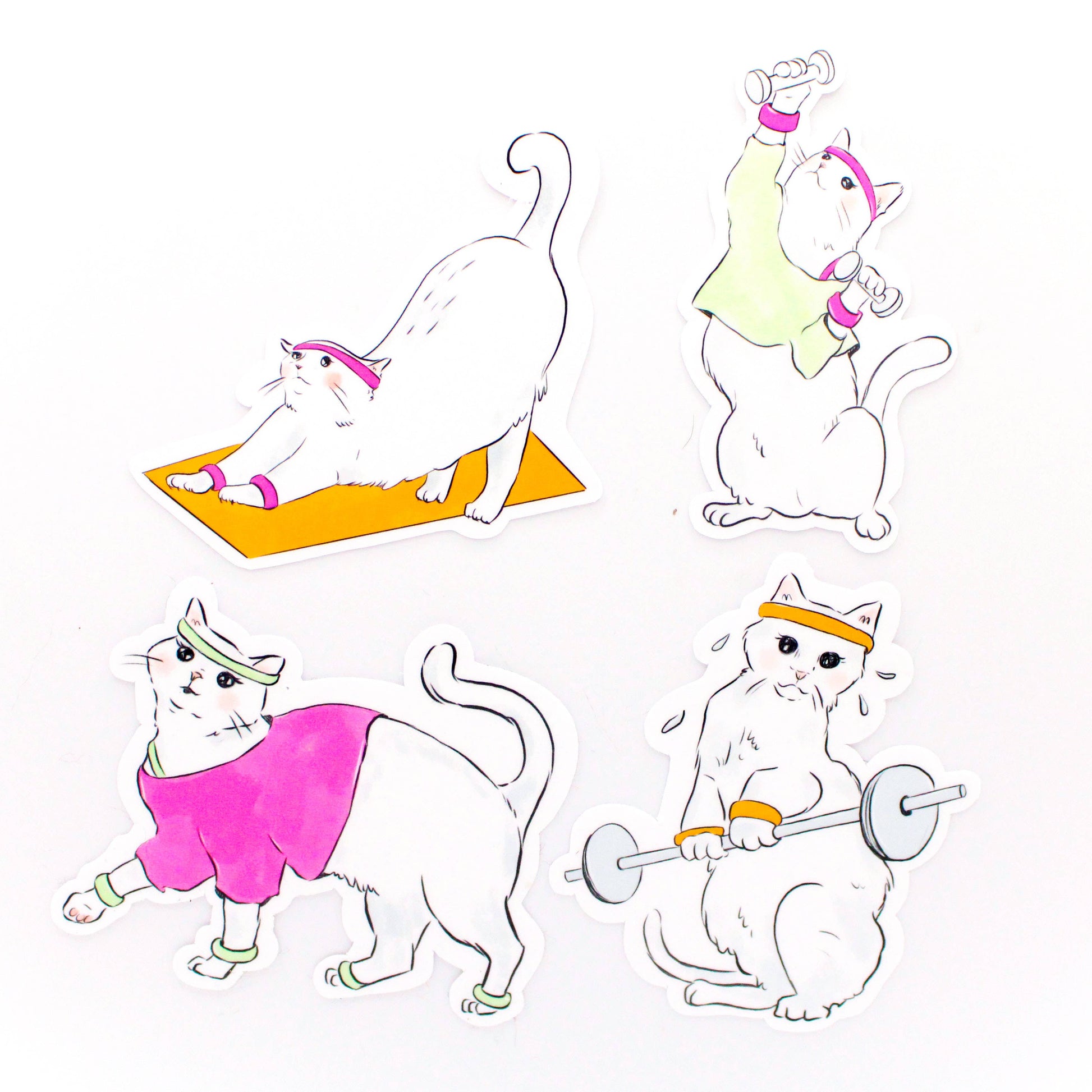 This adorable sticker pack contains 4 vinyl stickers- all the perfect size to decorate your water bottle, laptop, or just about anything that needs cute cats on it! 4 3” vinyl waterproof exercising kitty cat stickers.