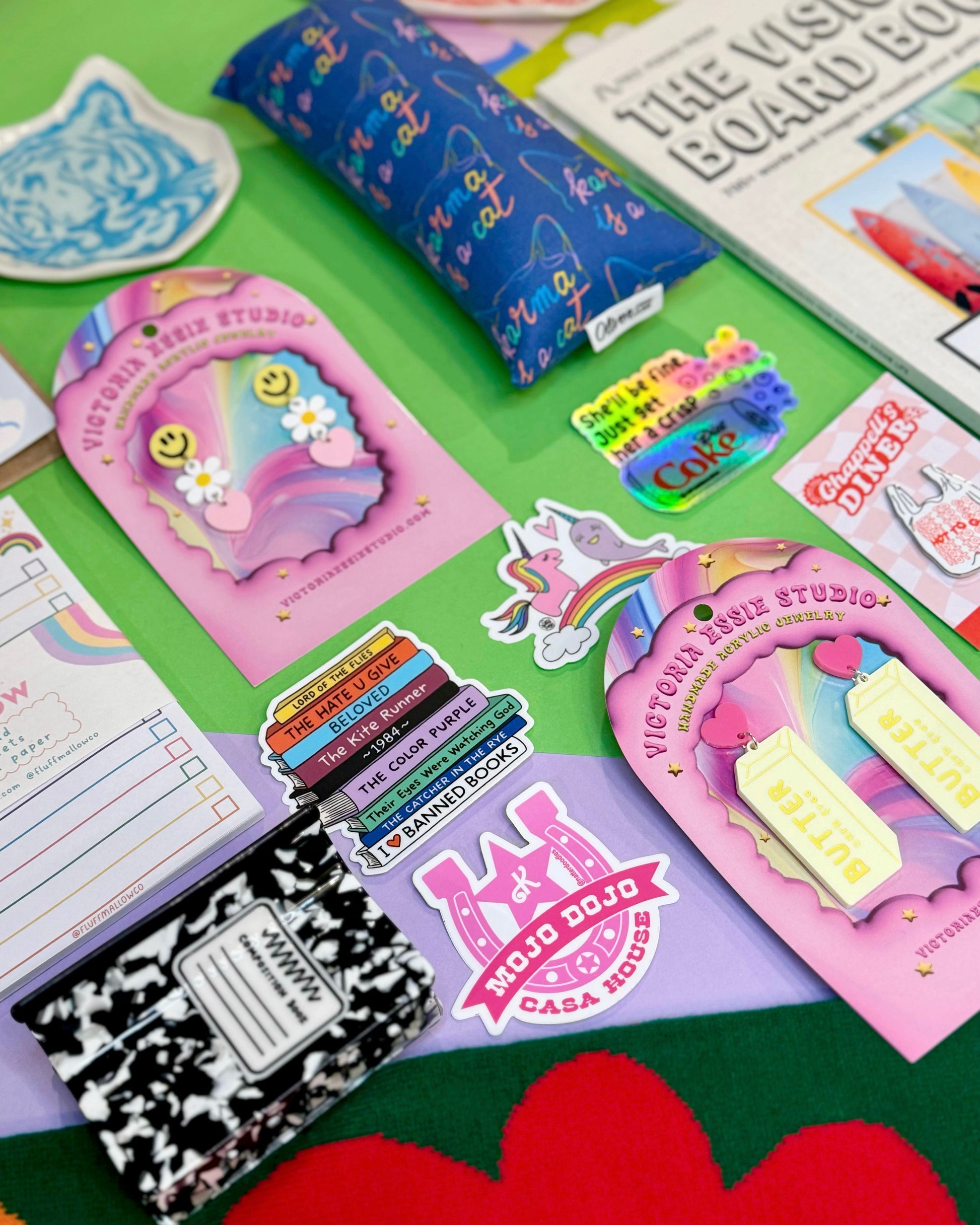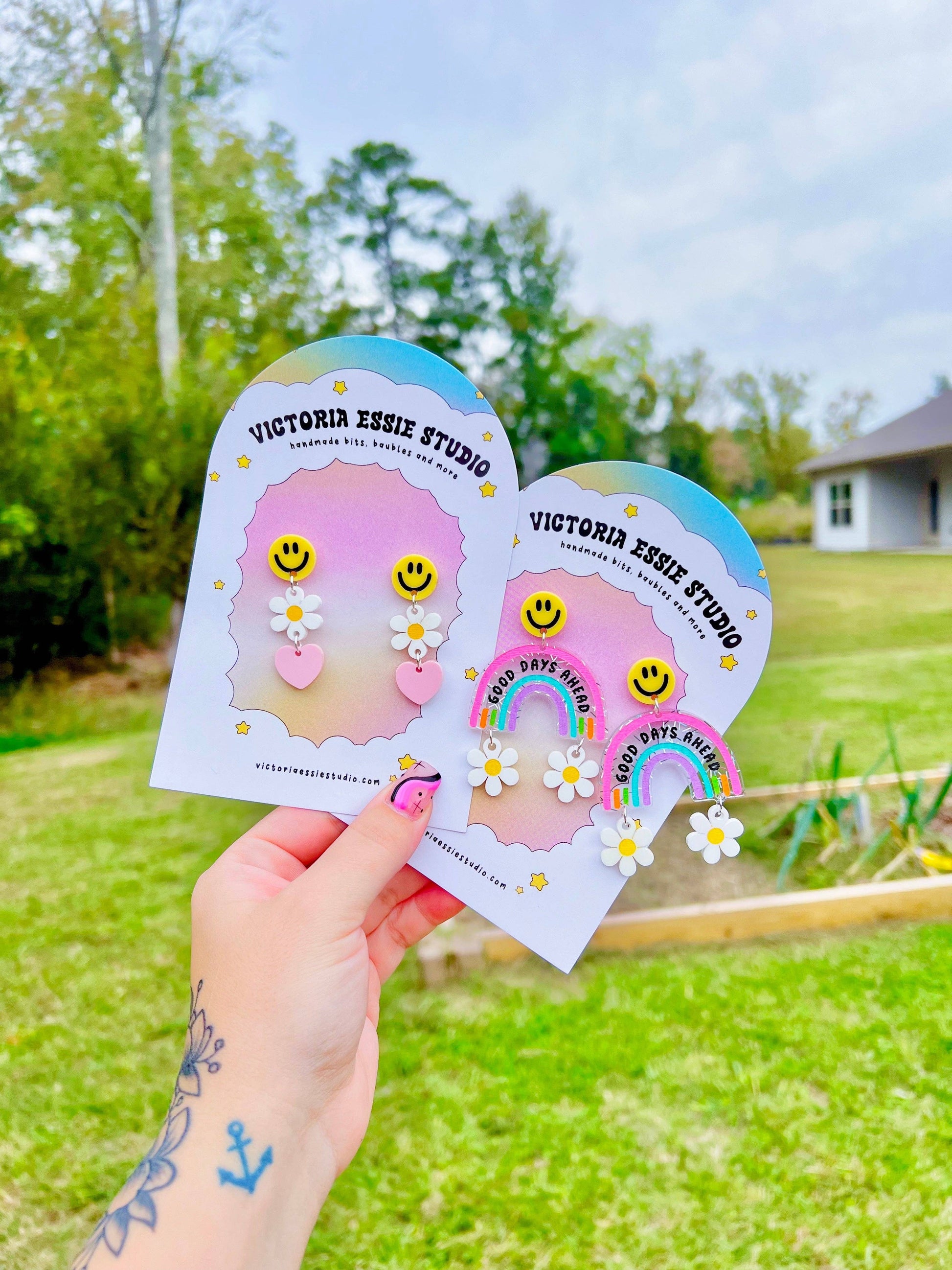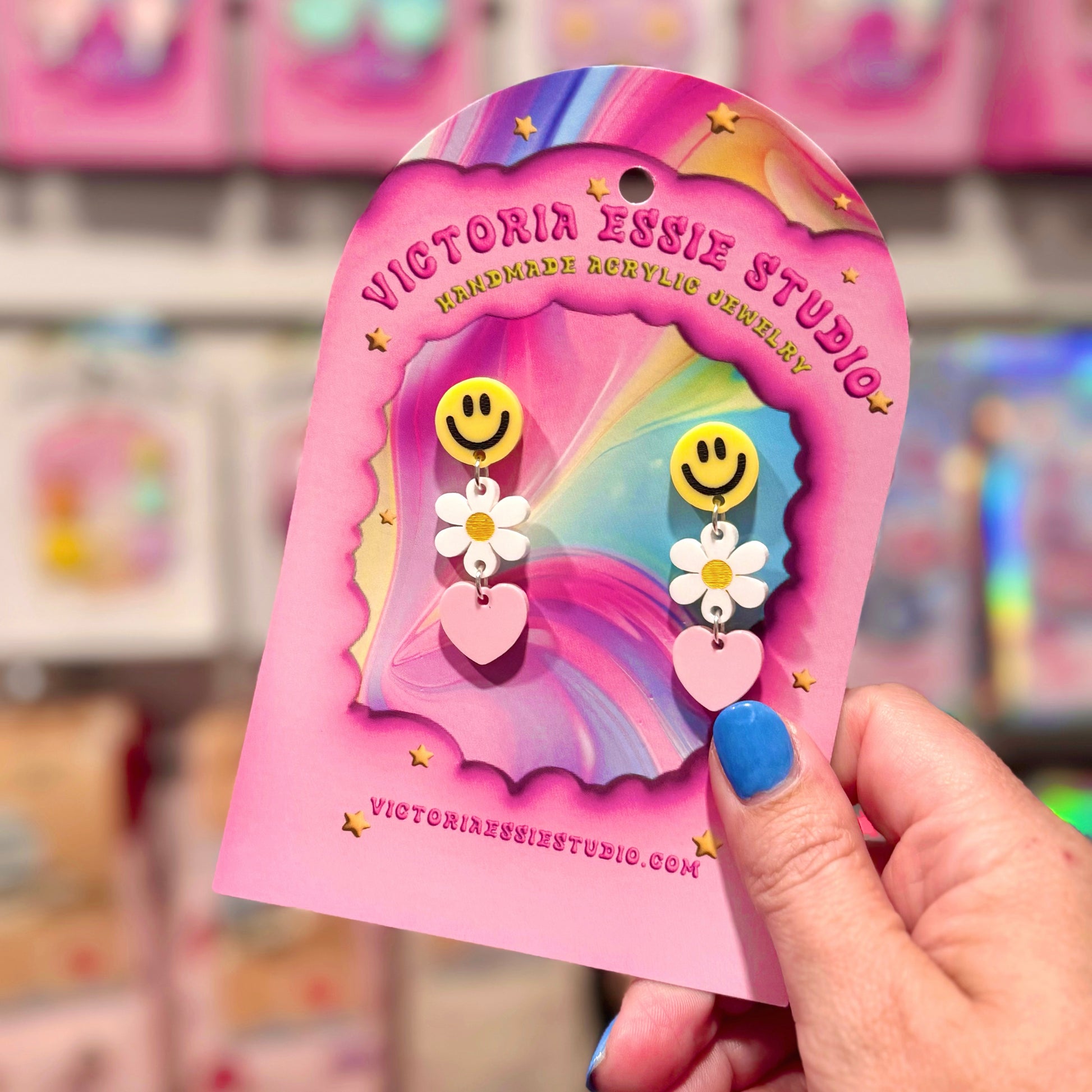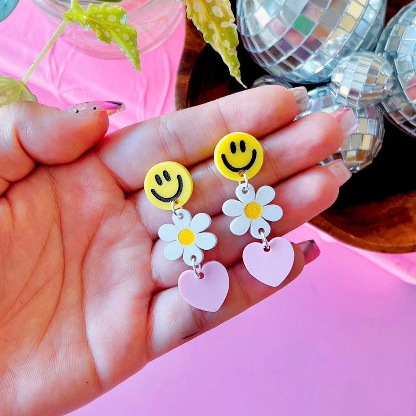smiley face heart daisy flower • 1.75” acrylic earrings • nickel-free • handmade • lightweight • surgical steel posts