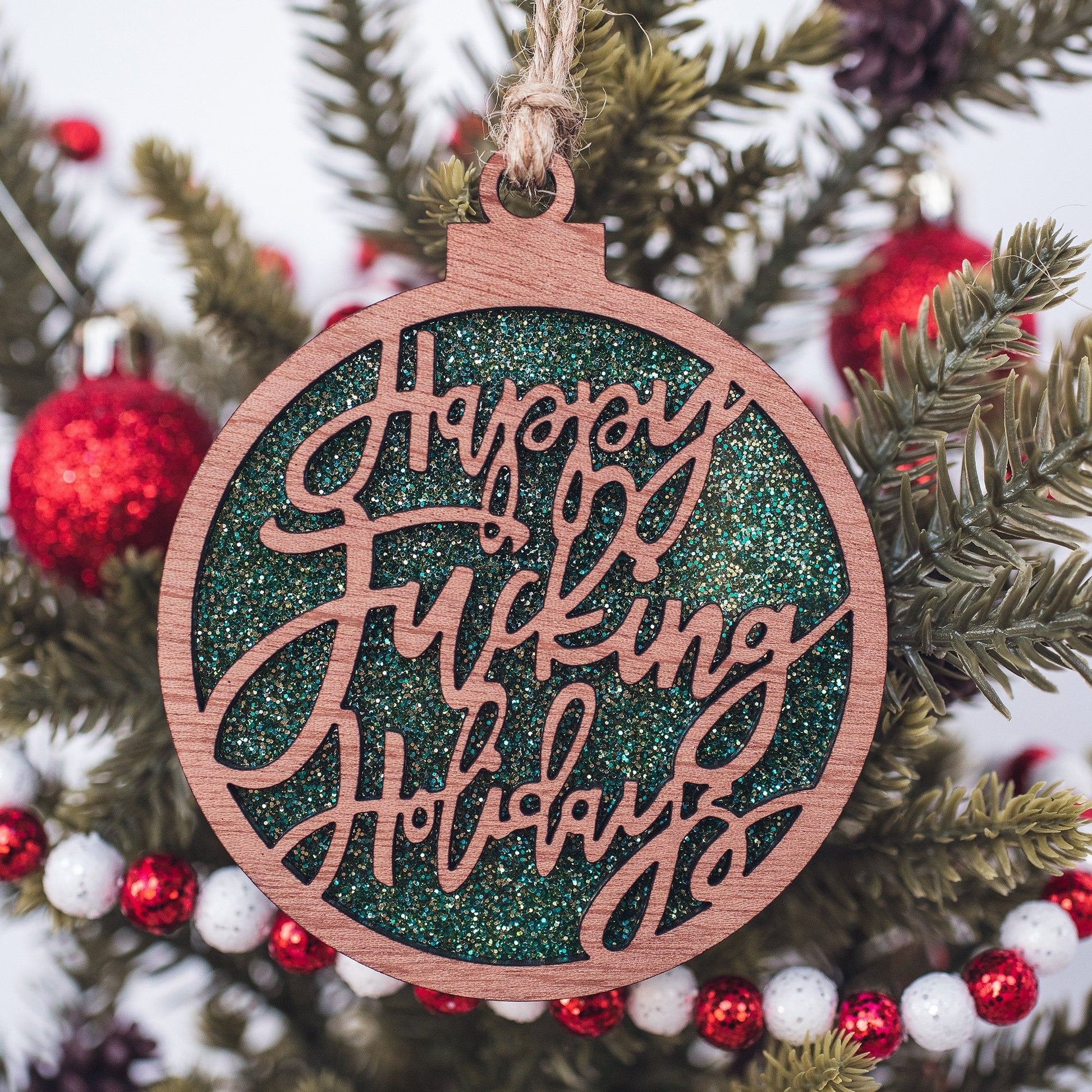 Green glitter happy fucking holidays ornament. 3.5 inch length, 1/4 inch thick and finished with twine. Hand drawn, laser cut.