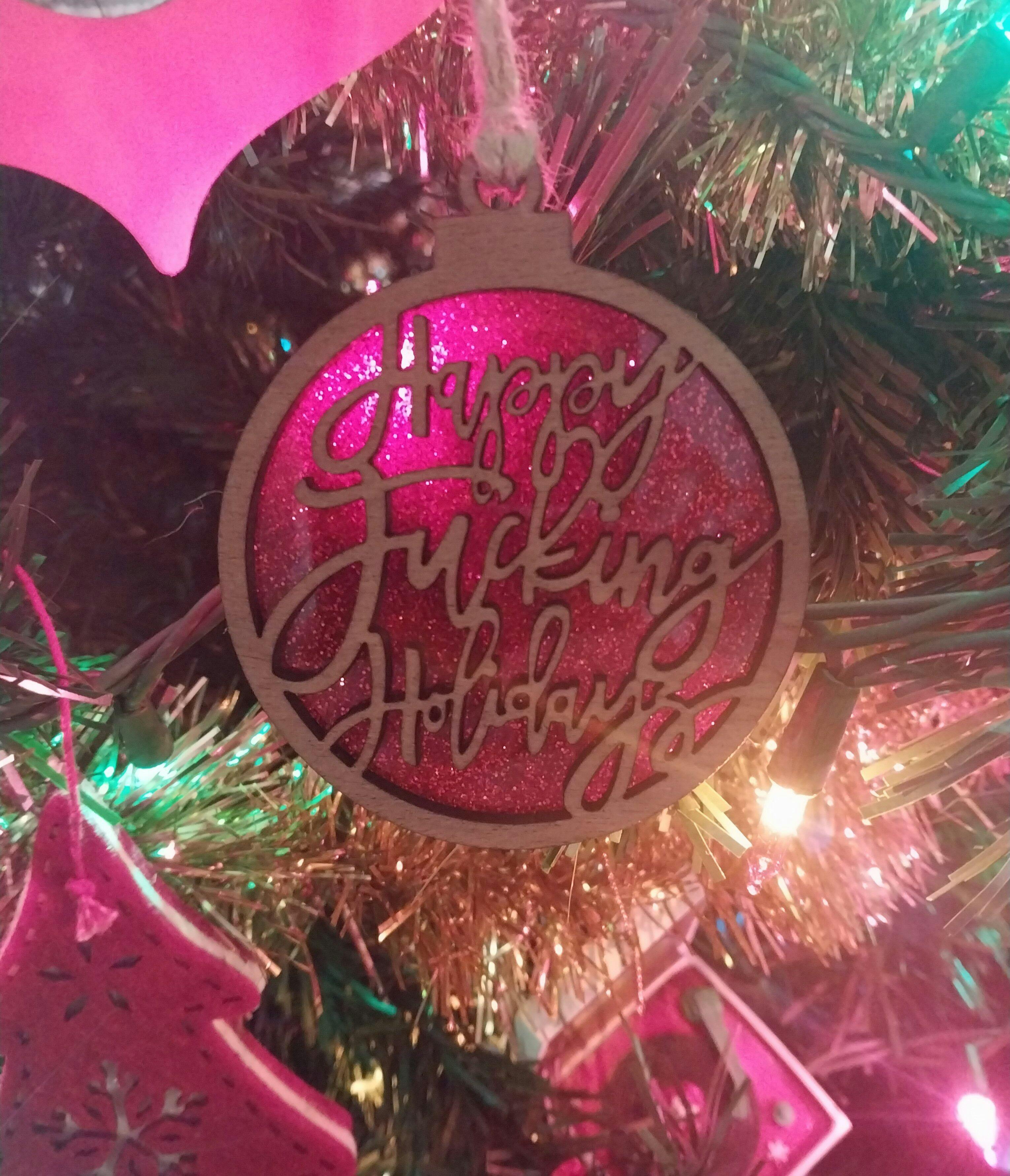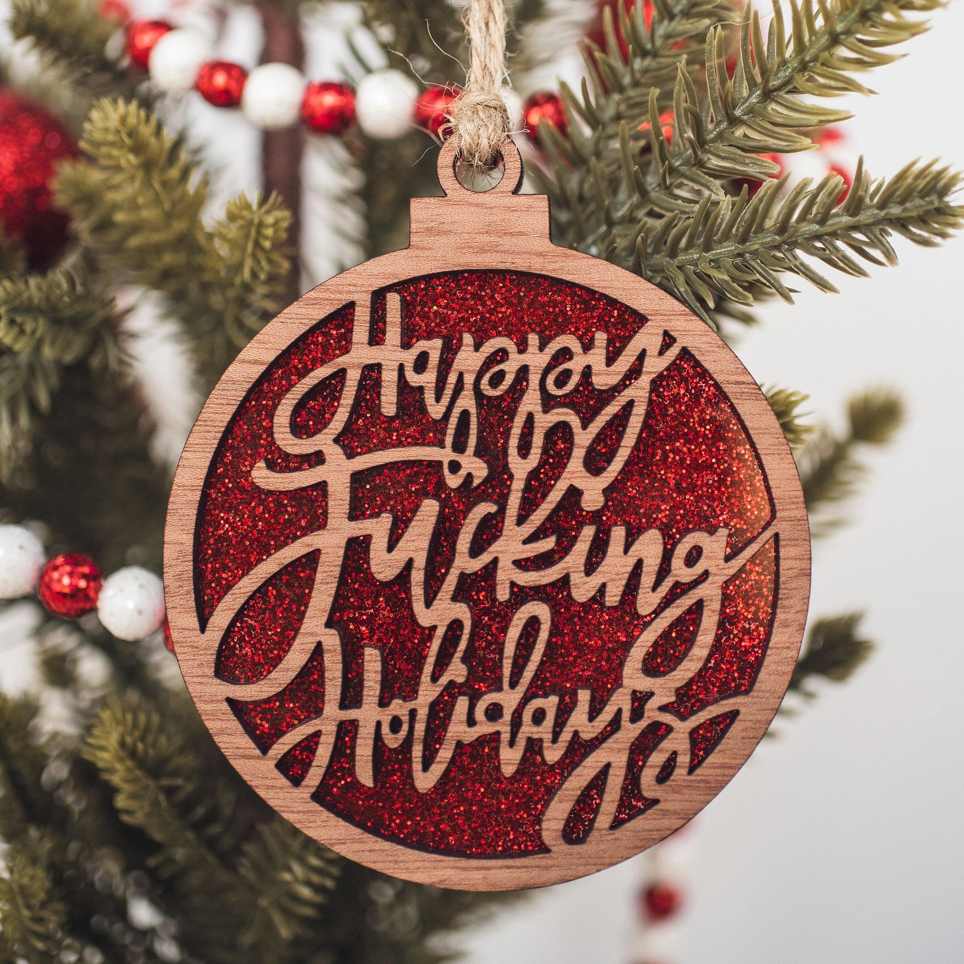 Red glitter happy fucking holidays ornament. 3.5 inch length, 1/4 inch thick and finished with twine. Hand drawn, laser cut.