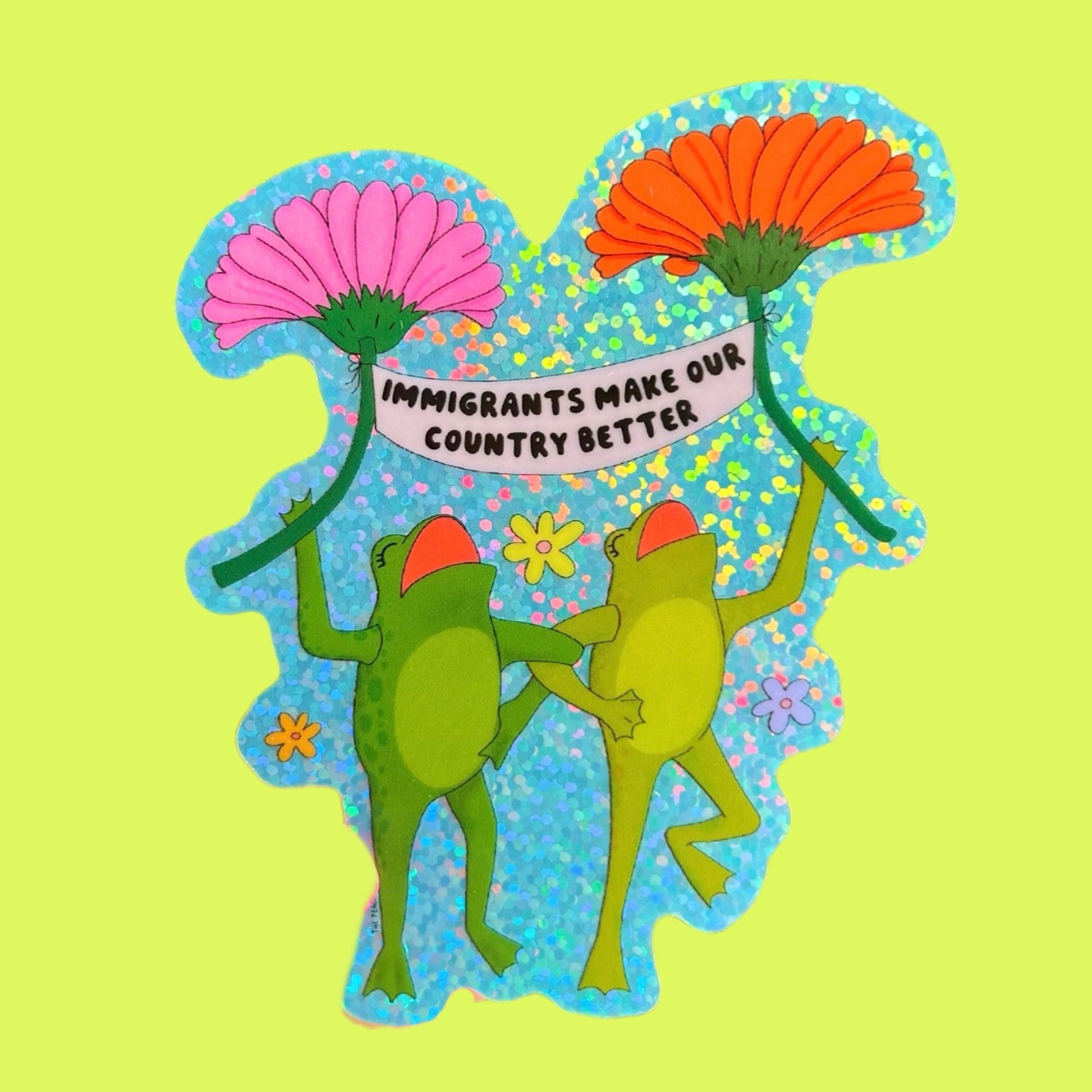 These froggies know what makes our country great: it's immigrants! Shout it from the rooftops with joy and rage and fervor and all you've got! Measures 3 x 3.5 inches ✿ fully waterproof ✿ Feature UV screening to protect against weather and sunlight ✿ 2-4 year minimum outdoor life