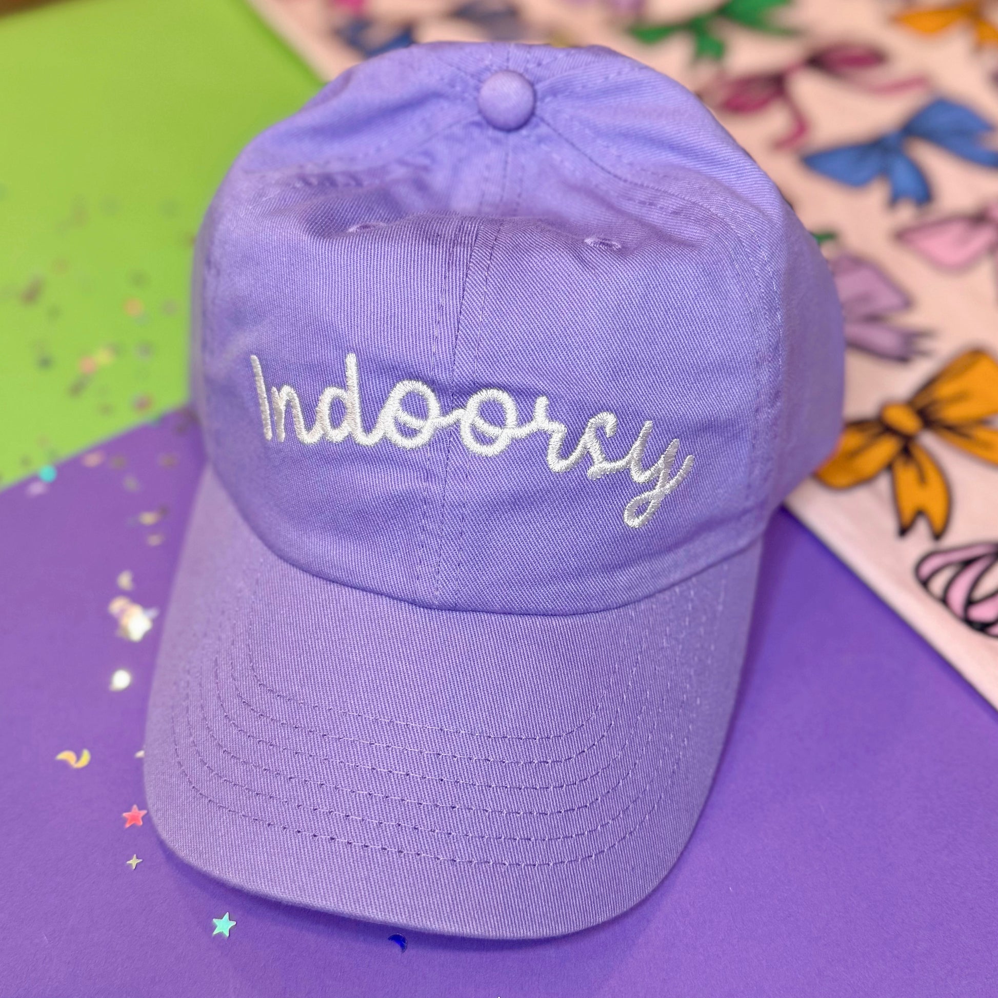 Indoorsy stitched in white on a relaxed fit hat. Includes a brass slider in the back to adjust fit.