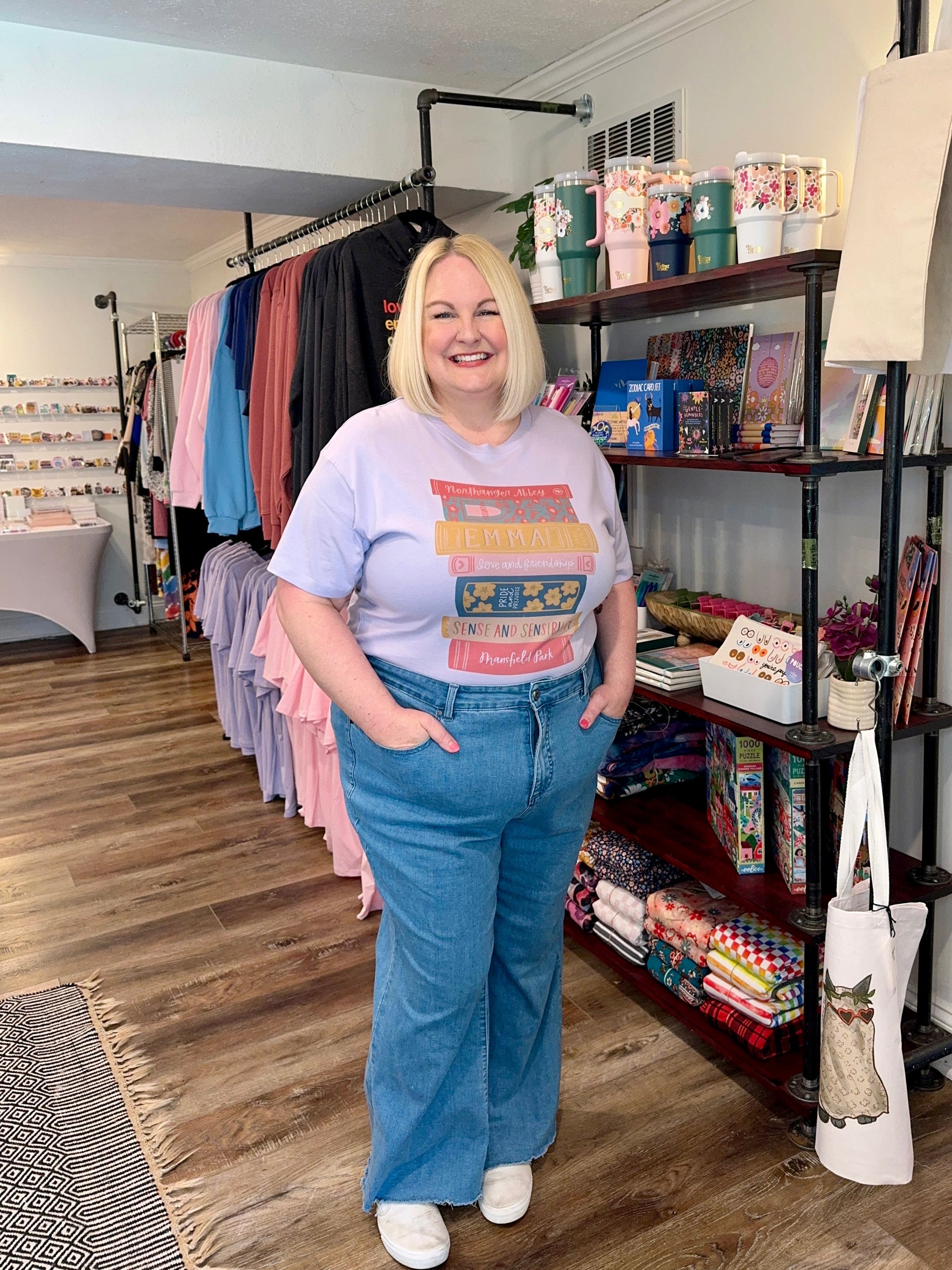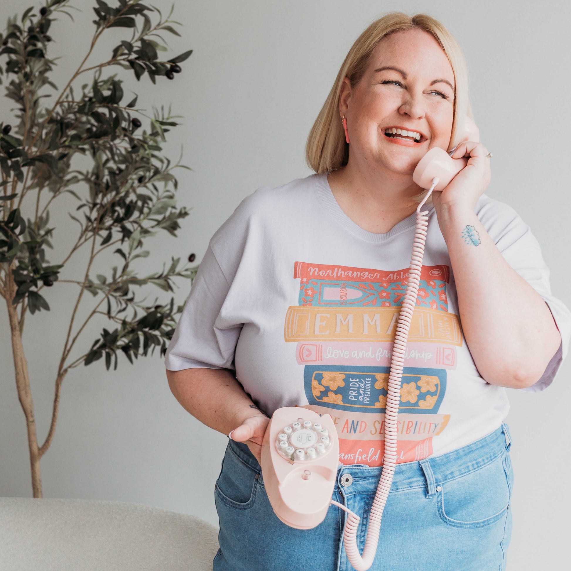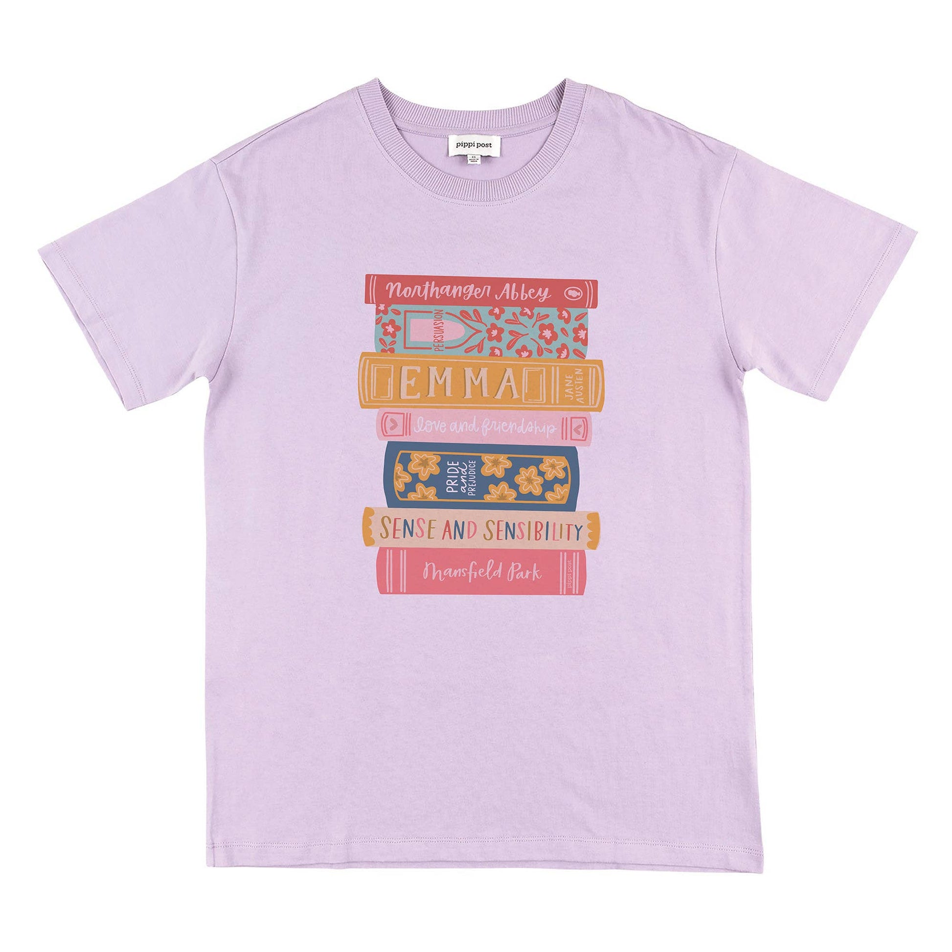 100% cotton lilac tee shirt. Jane Austen books: Northanger Abbey, Persuasion, Emma, Love and Friendship, Pride and Prejudice, Sense and Sensibility, Mansfield Park