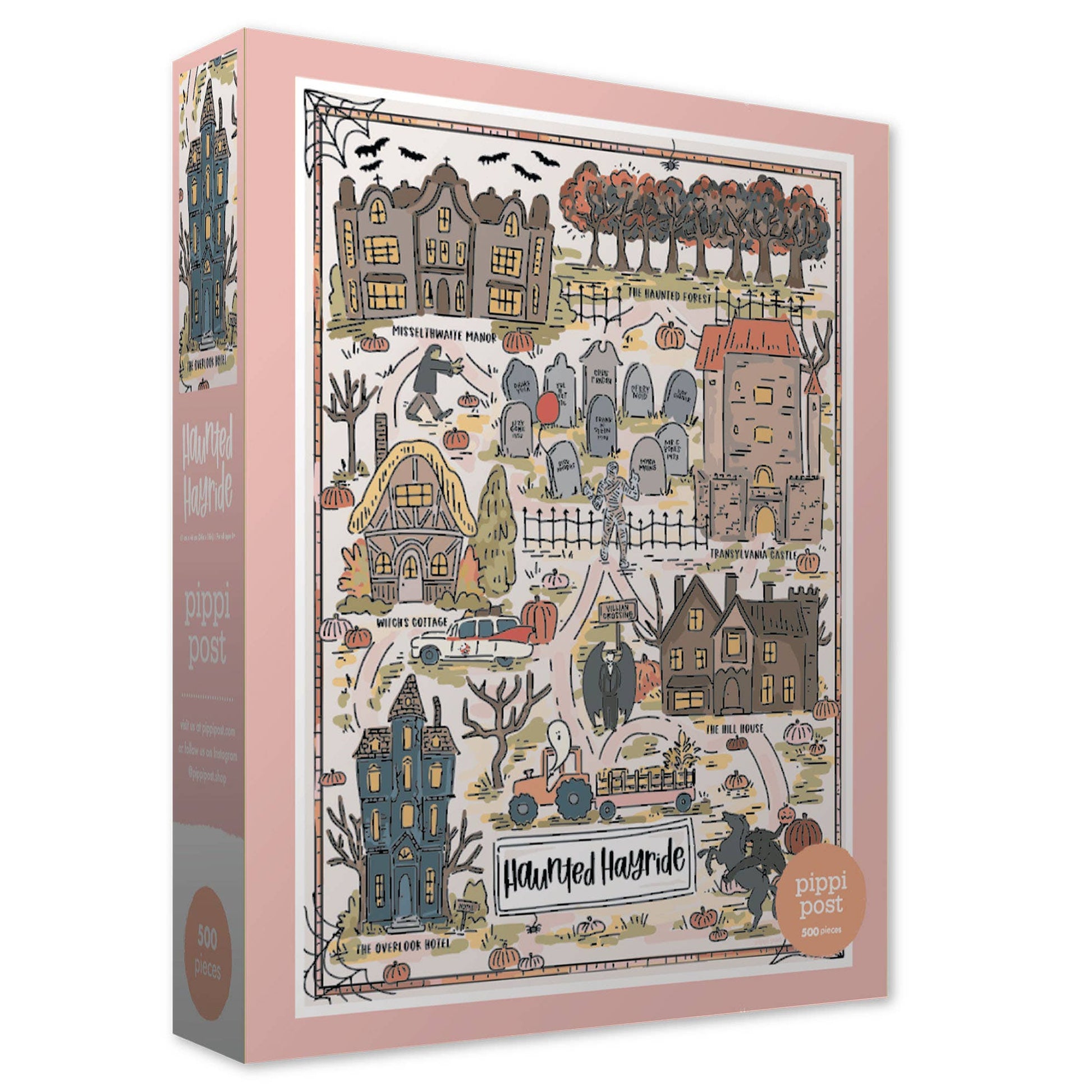 Take a ride through a world of literary haunts! This Haunted Hayride 500-piece jigsaw puzzle is packed with spooky surprises, from eerie mansions to famous ghostly landmarks. Featuring hand-illustrated details of legendary haunts—like Misselthwaite Manor, Hill House, and Transylvania Castle—this puzzle is the perfect way to celebrate Halloween while cozying up with a challenge. Perfect for book lovers, puzzle enthusiasts, and anyone who loves a little fright with their fall fun!