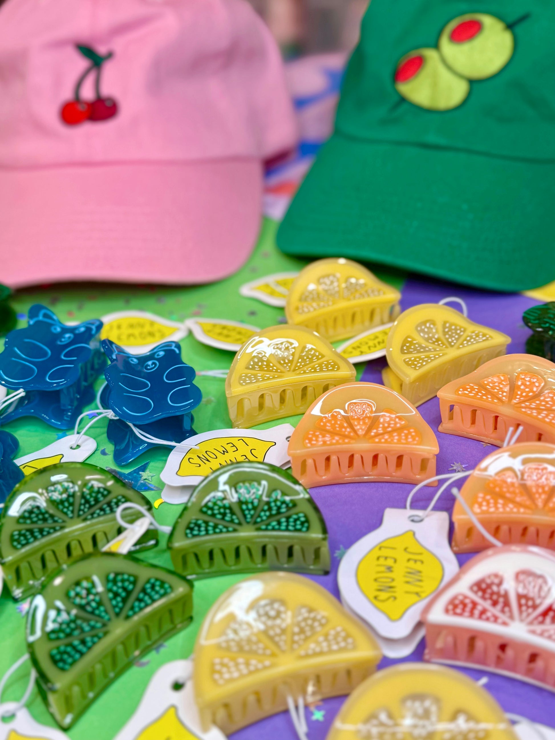 hand-painted 2” grapefruit hair claw clip • made from cellulose acetate, a plant-based and biodegradable alternative to plastic! • designed in San Francisco, California by Jenny Lemons • ethically produced in China