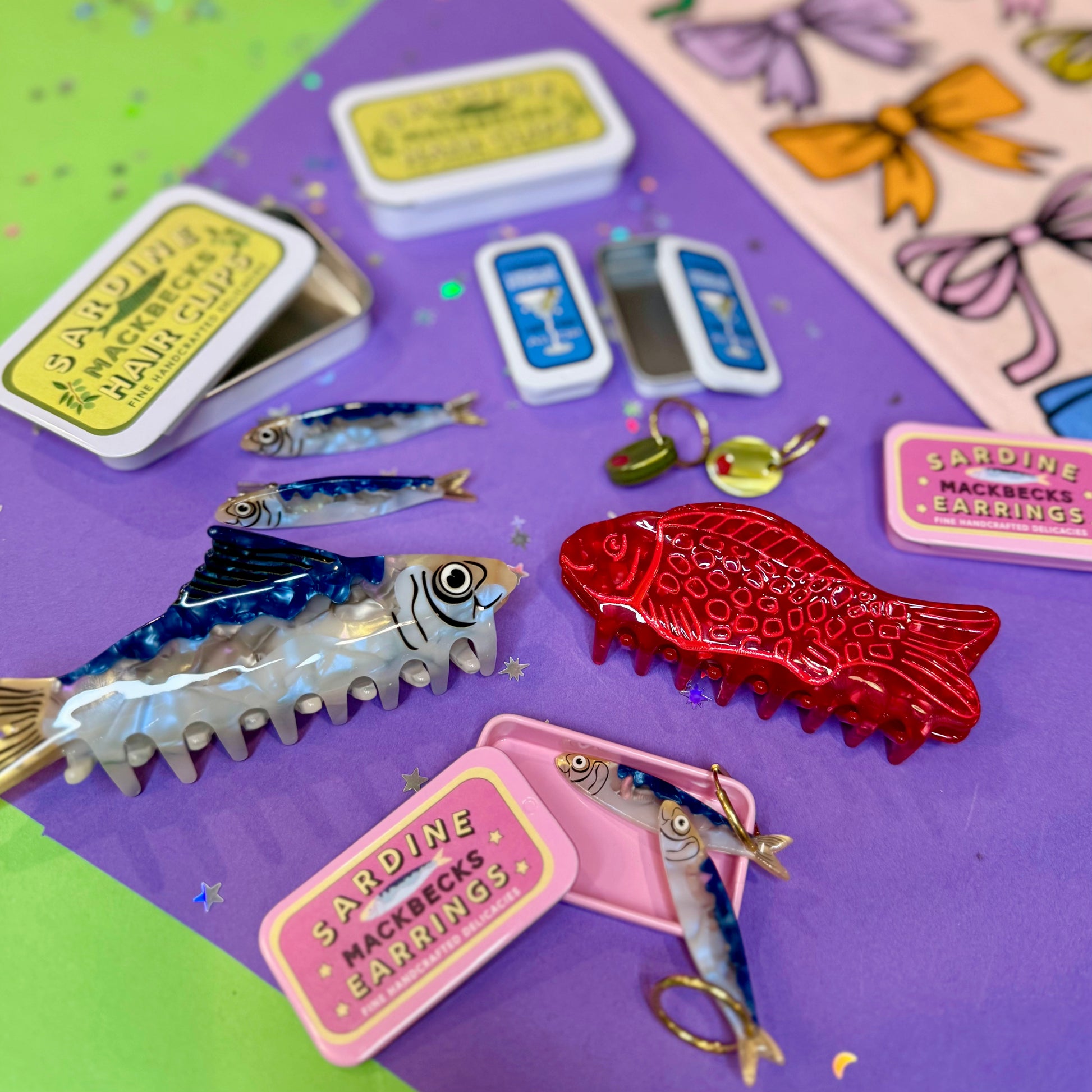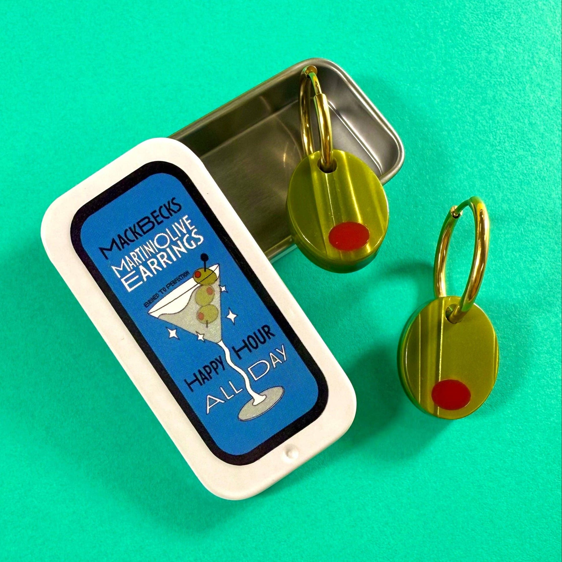 For those who like their accessories a little dirty. The Olive Earrings are a savory nod to cocktail hour, styled like the perfect martini garnish. Each earring is made from glossy, marbled cellulose acetate and hung from 20 mm gold-plated hinged hoops — lightweight, comfortable, and made to wear on repeat. Packed in a tiny, top-shelf tin with vintage cocktail bar styling, they’re designed to slip into your daily rotation — as easy to reach for as a bowl of briny olives.