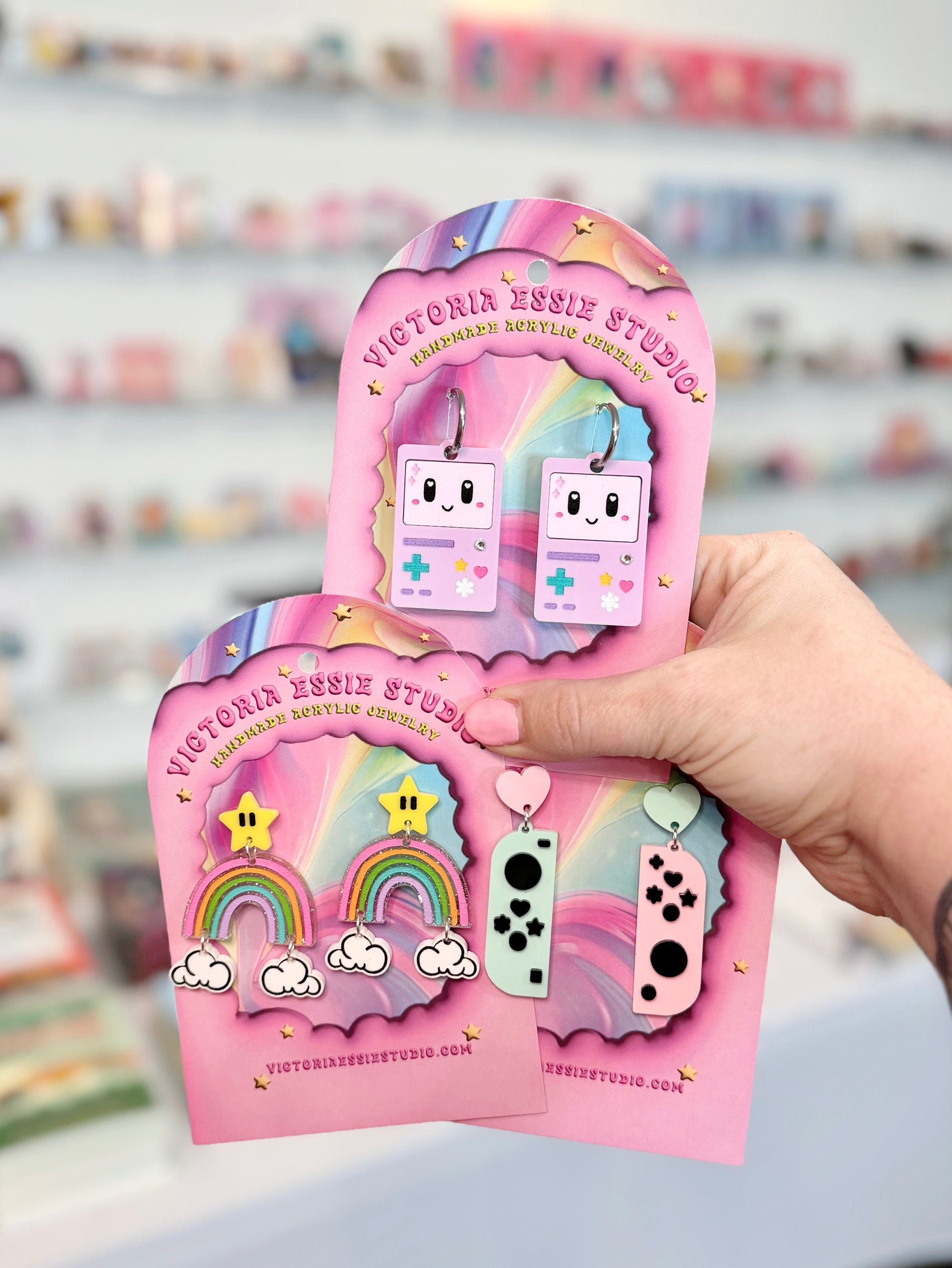 Game on with these pastel Nintendo Switch-inspired gamer earrings! Lightweight with surgical steel post. Finding will depend on availability (nickel-free). Each pair is hand made with care. No two pieces are the same and will vary slightly from picture. To reduce waste, most items are made to order. 2” in length