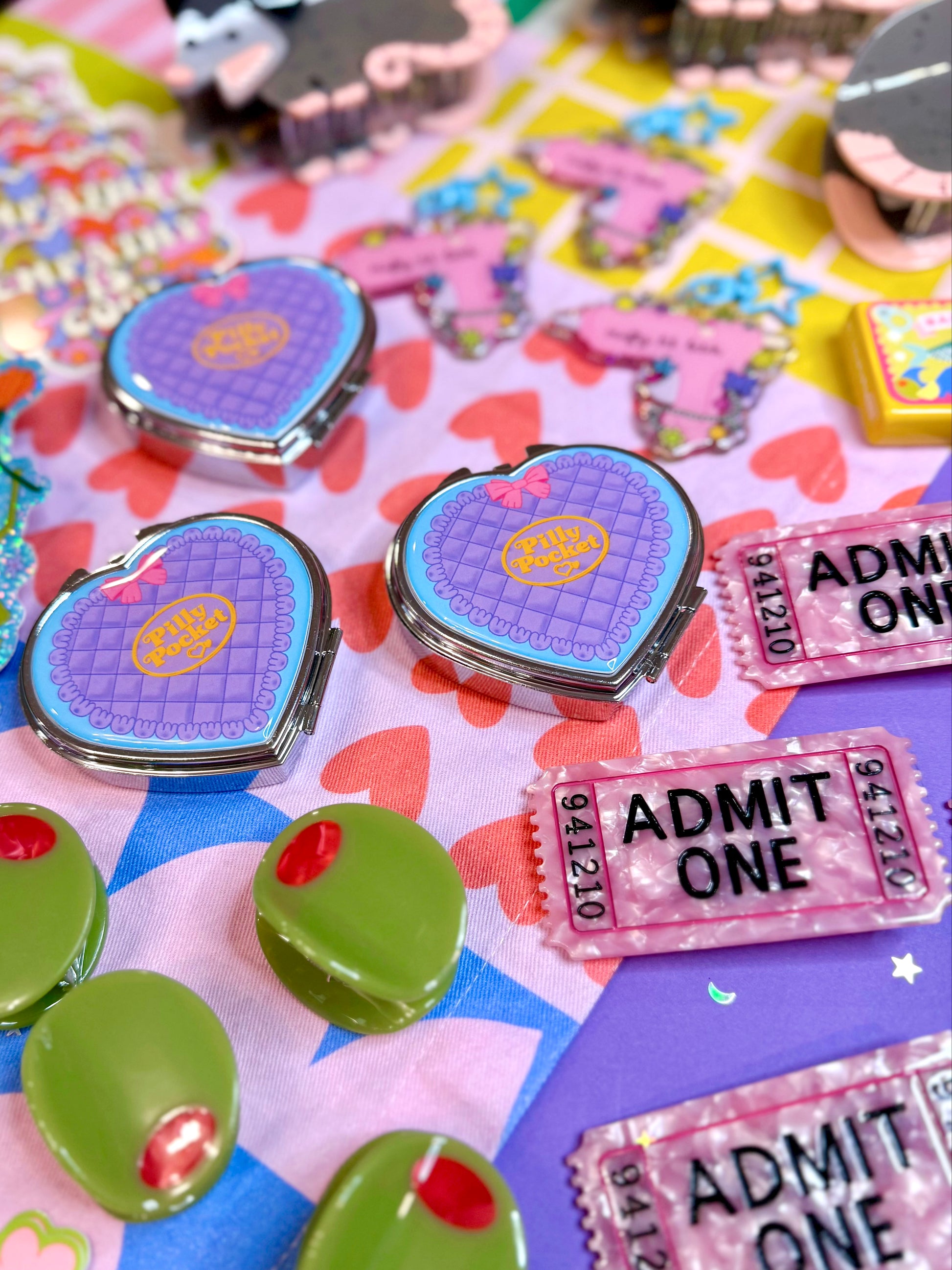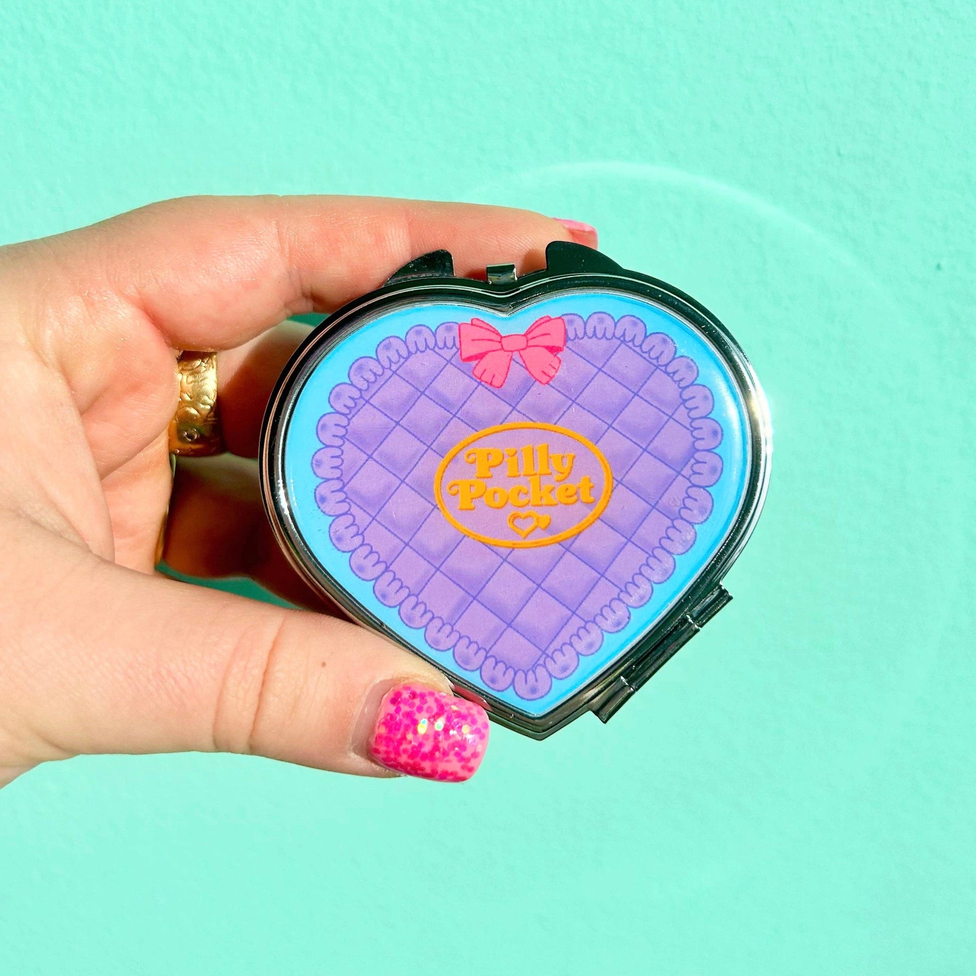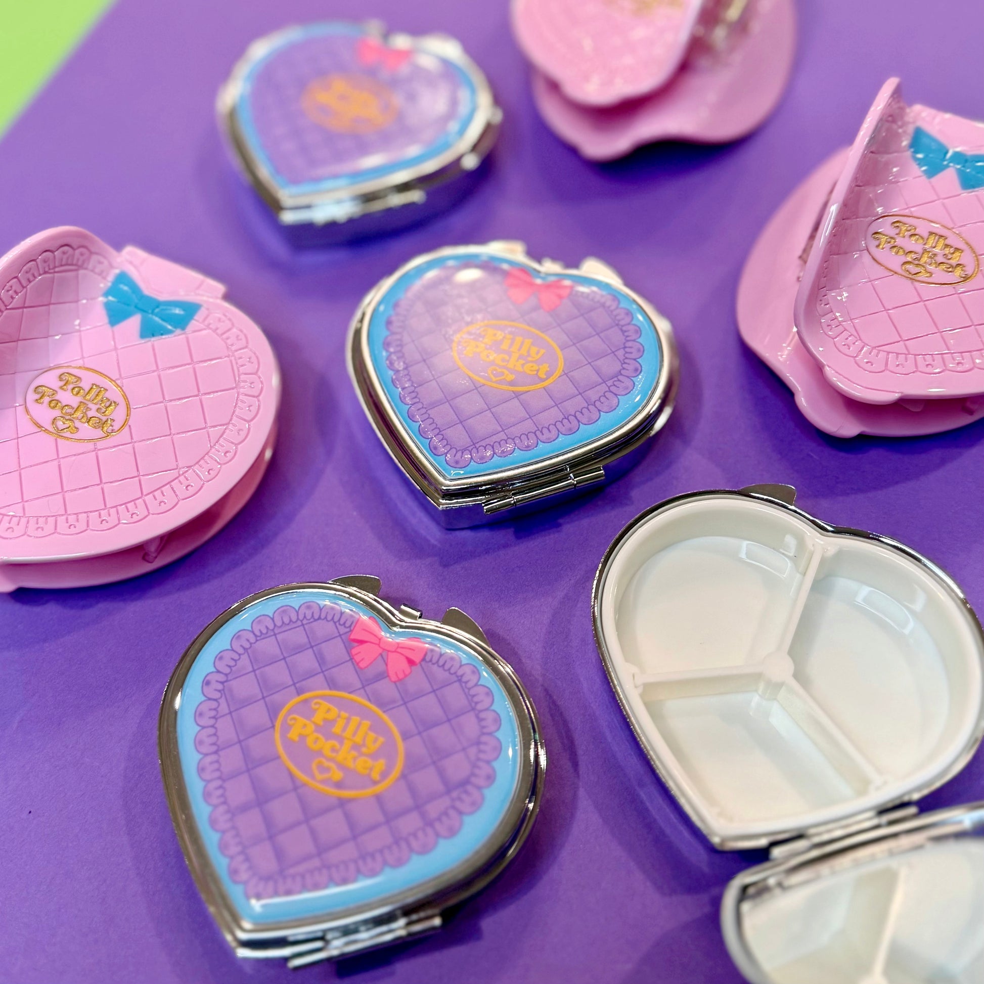 Never be without your meds again! This portable Polly Pocket inspired pill container is perfect for bringing your lactaid and ibuprofen with you wherever you go! It has a secure closure to prevent spills, a divided internal space to keep things organized, and even has a mirror in the lid!