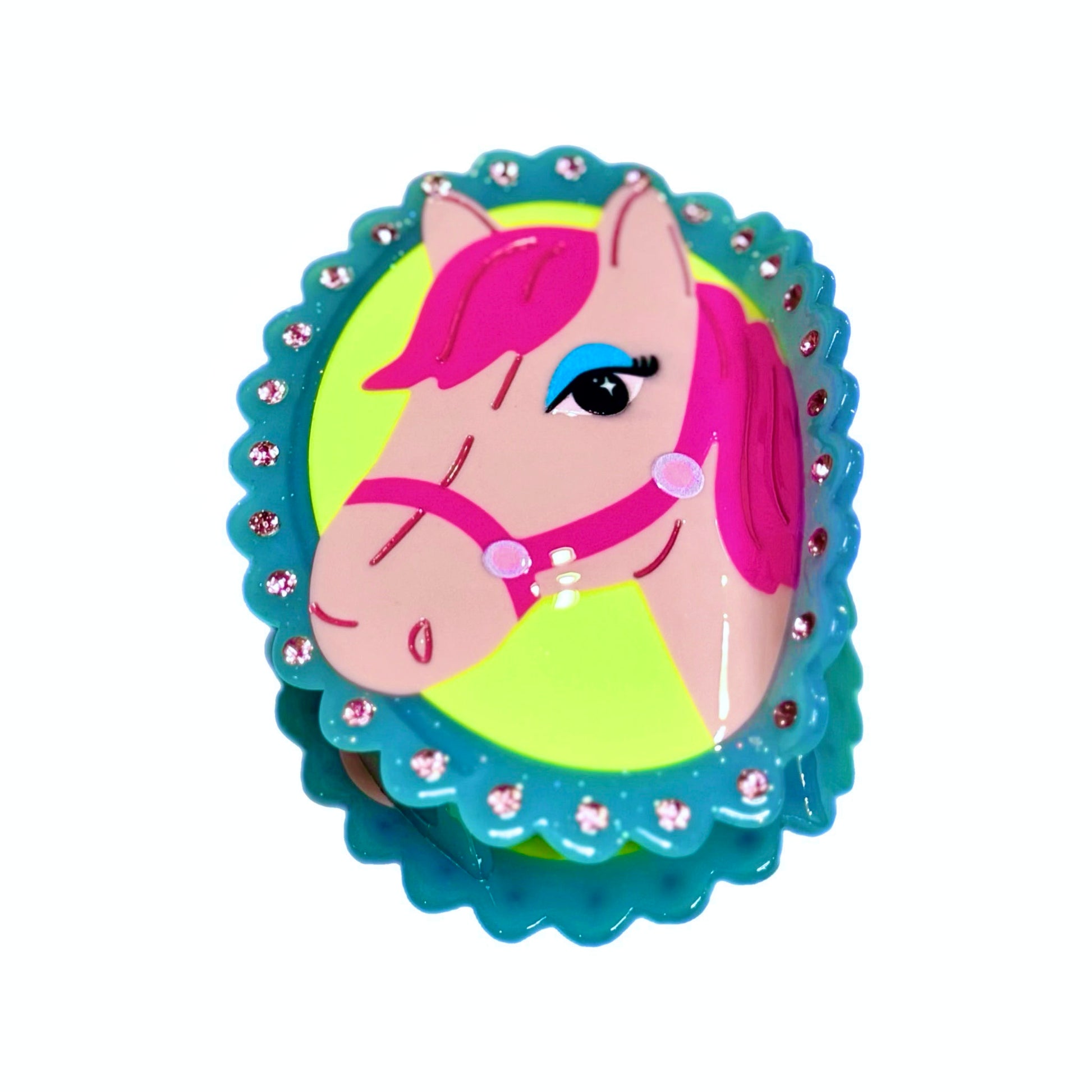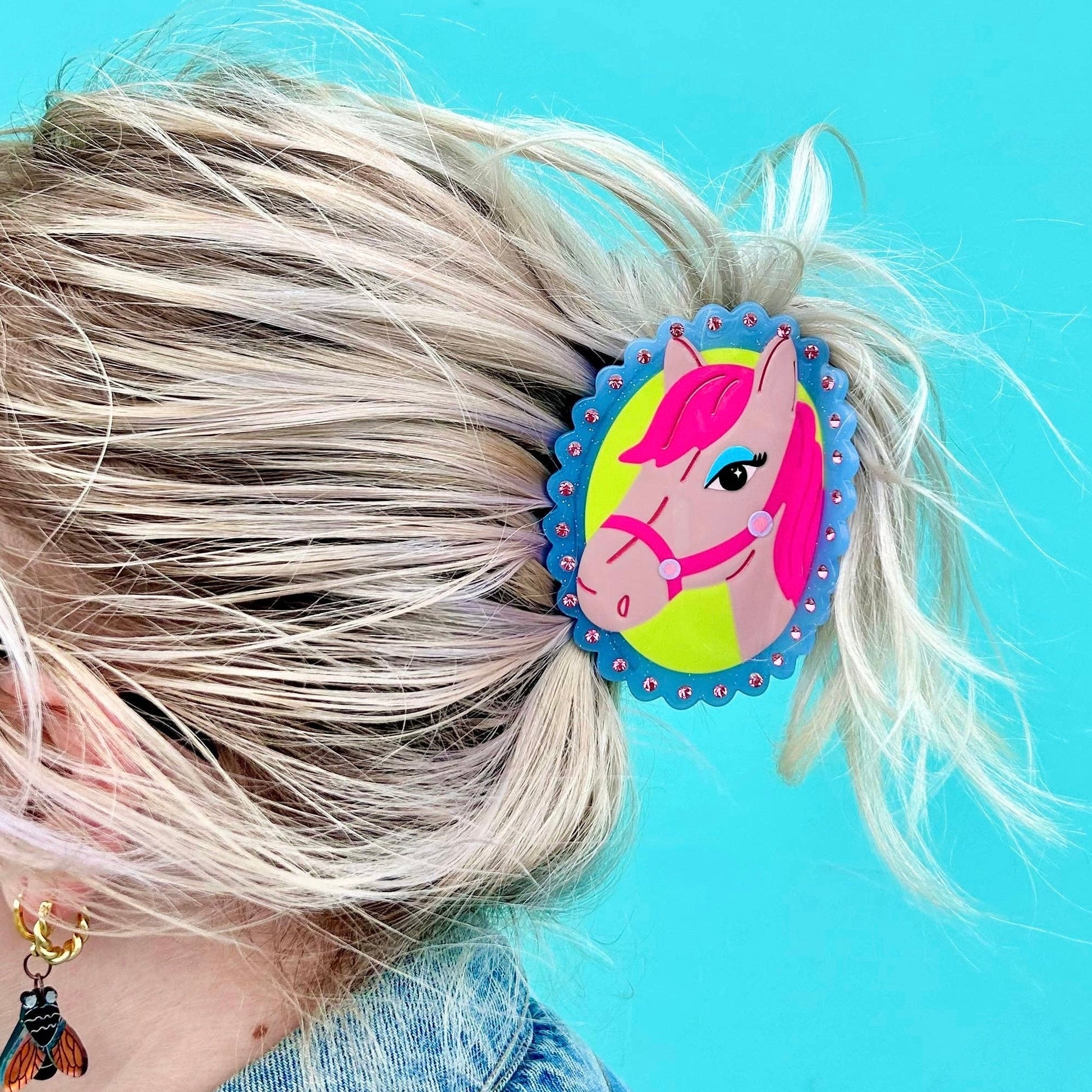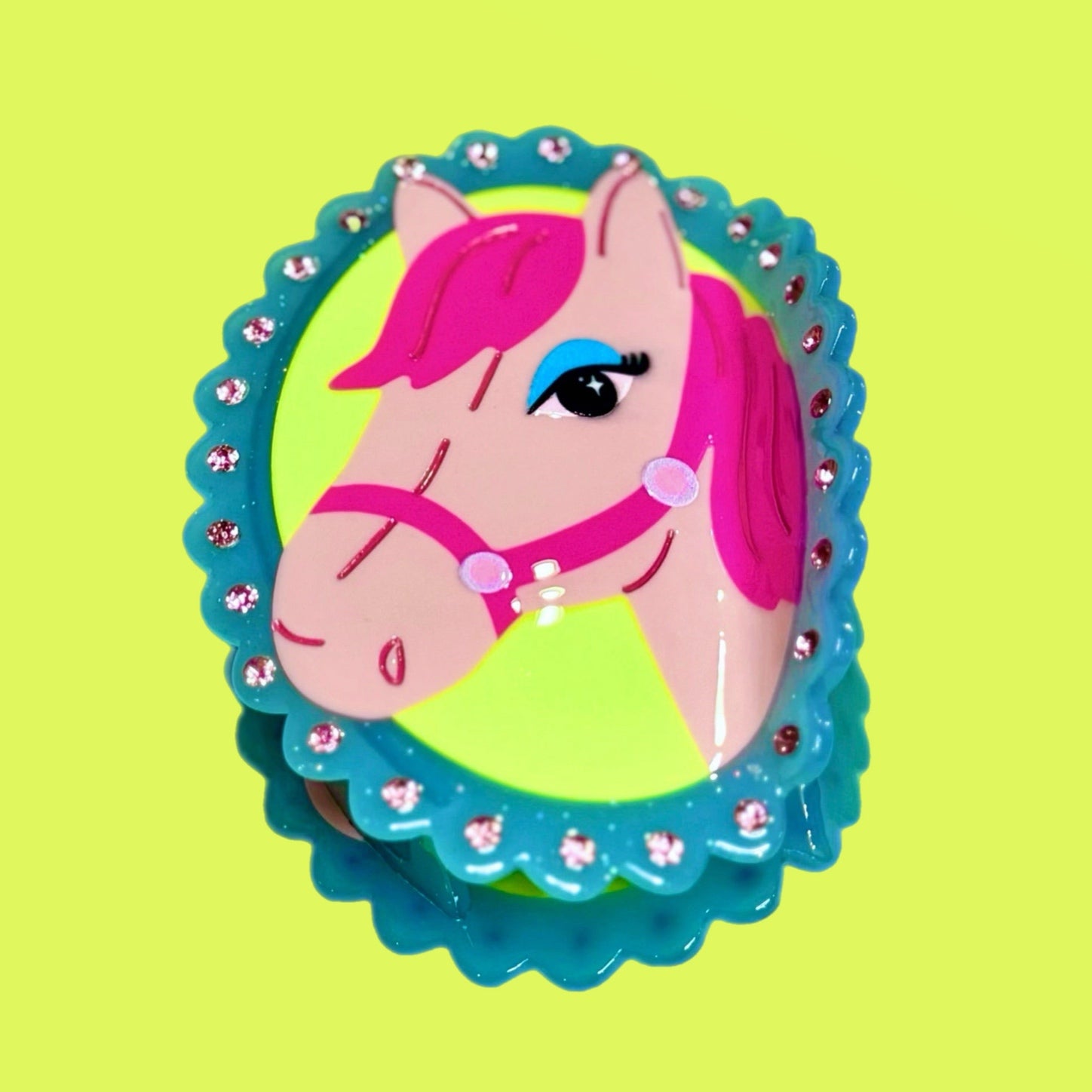 He Take the pink pony club anywhere you go with this iconic horse cameo hair claw! Complete with sparkles and rhinestones!