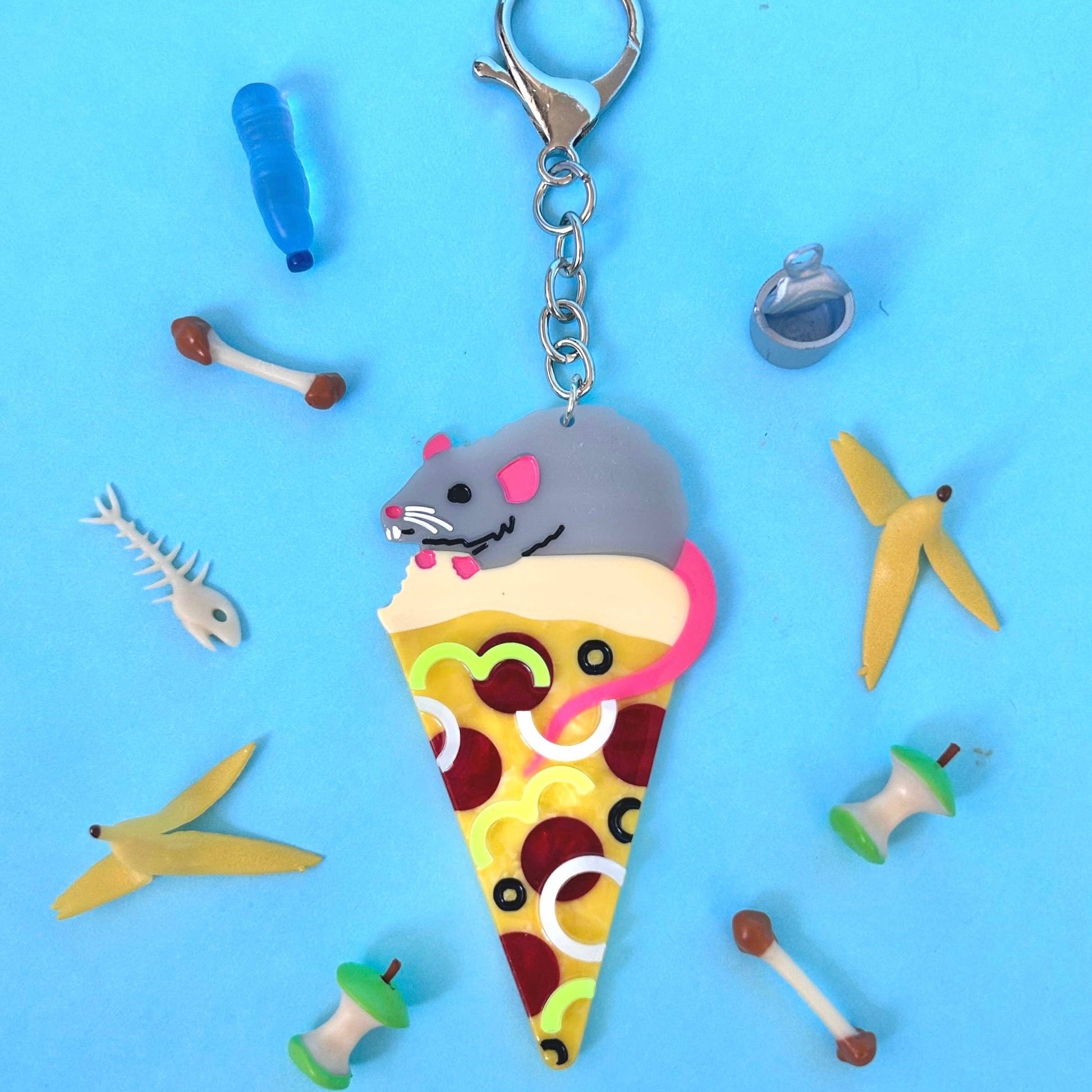 He's been holding on to this slice of pizza with all his might and is prepared to do the same for your keys. Made of cellulose acetate (plant-based!) Charm measures 3.5 inches, with chain total length is 6 inches.