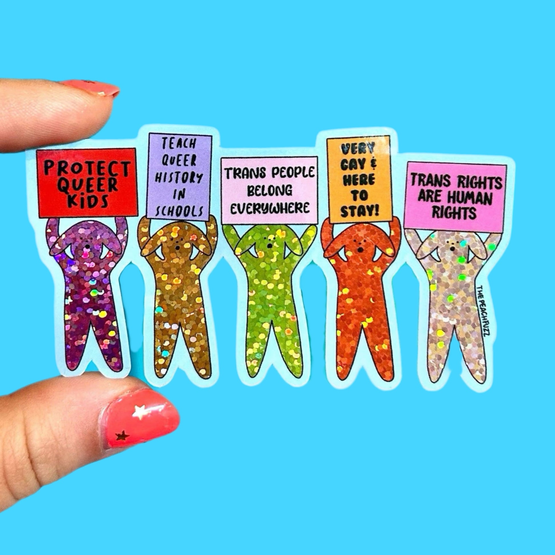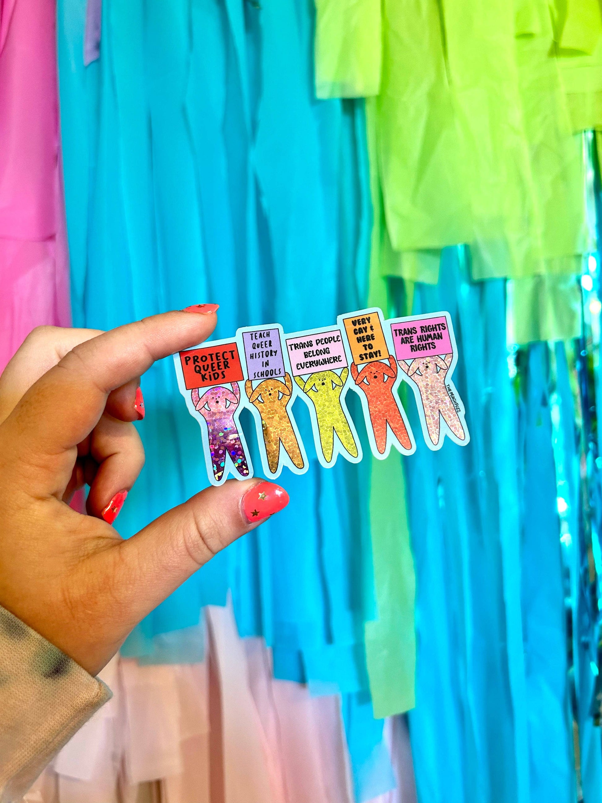 The puppies are back to remind you to keep up the fight for right to be proud of who you are! Protect trans kids! Teach queer history! Celebrate queer joy! Vinyl waterproof sticker.