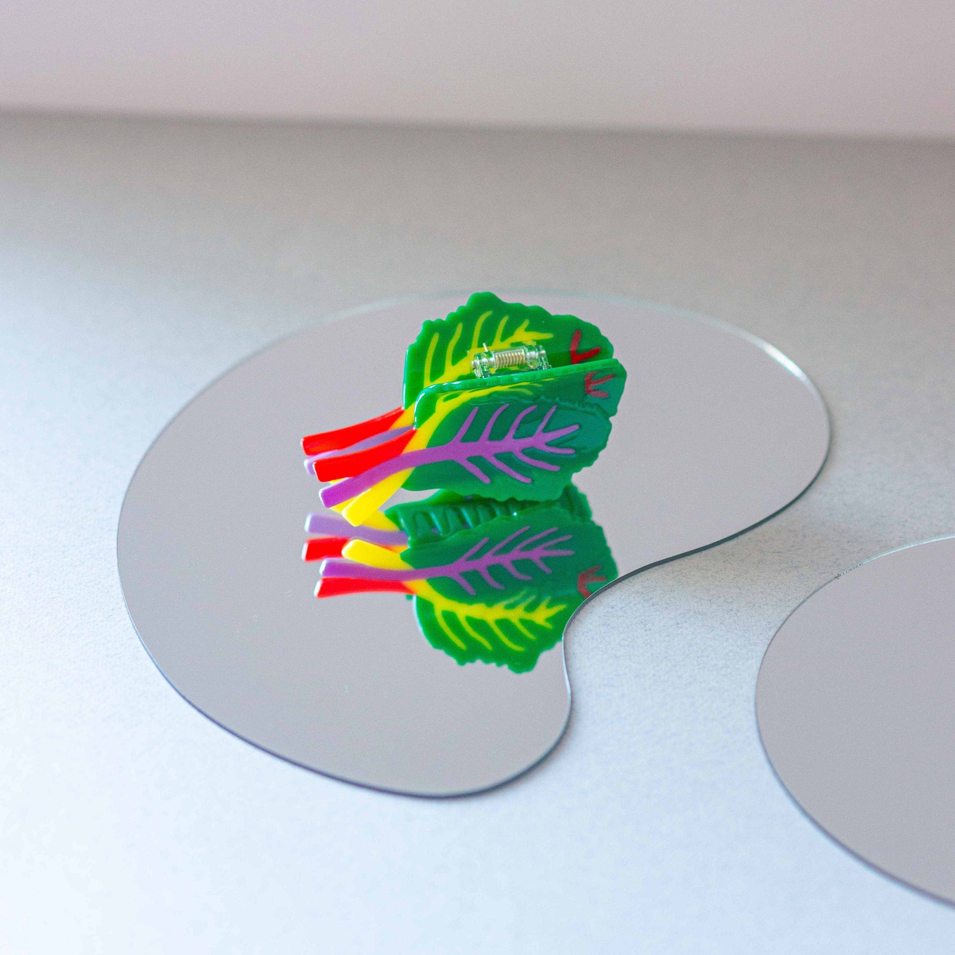 hand-painted 4” rainbow chard hair claw clip • made from cellulose acetate, a plant-based and biodegradable alternative to plastic! • designed in San Francisco, California by Jenny Lemons • ethically produced in China