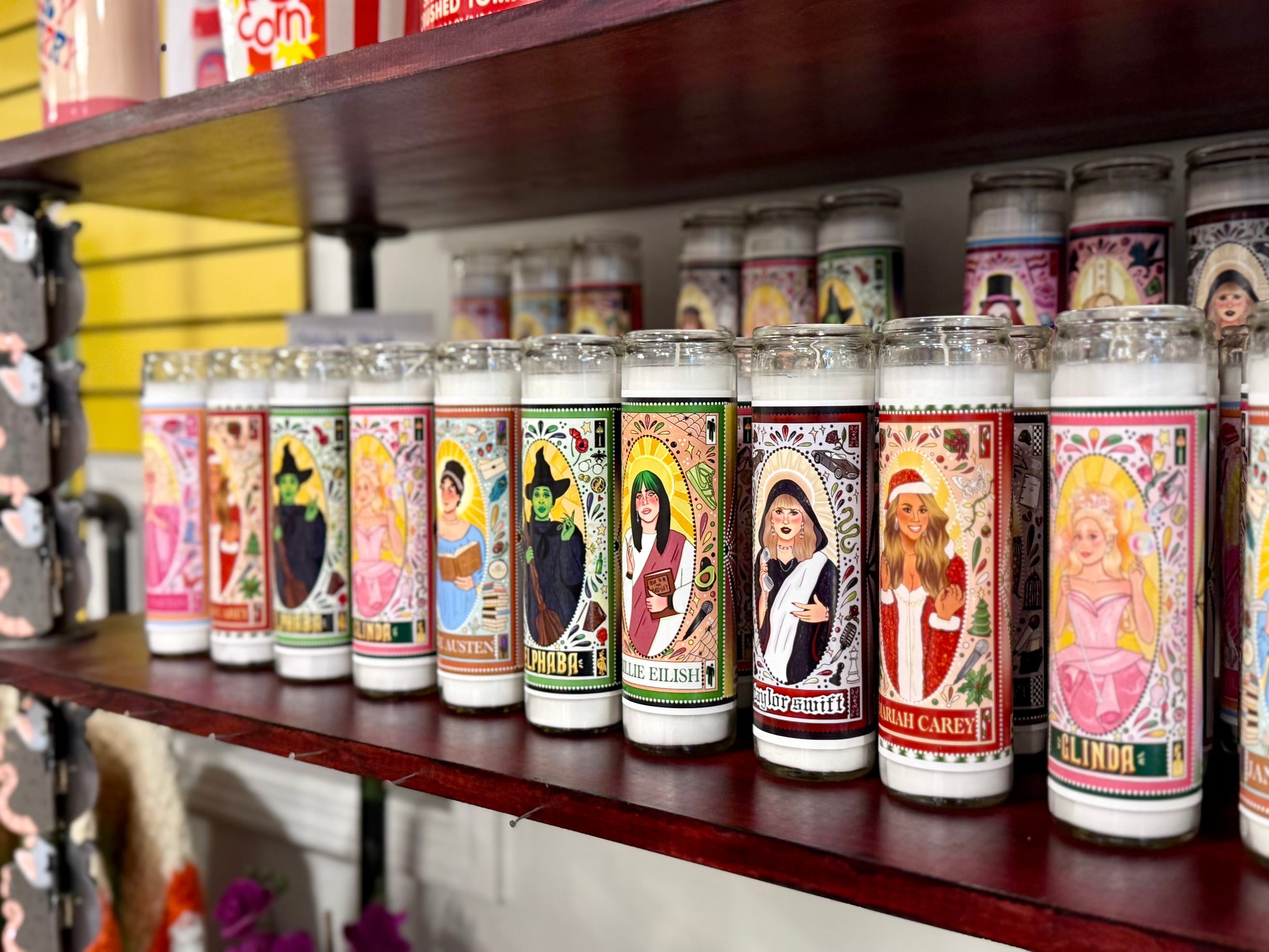 Can this candle really get any more Billie themed? The candle is made of thick glass with white wax. If you burn the candle, it has about a 60-80 hour burn life, but this is really just meant to be decor—a secular saint candle!