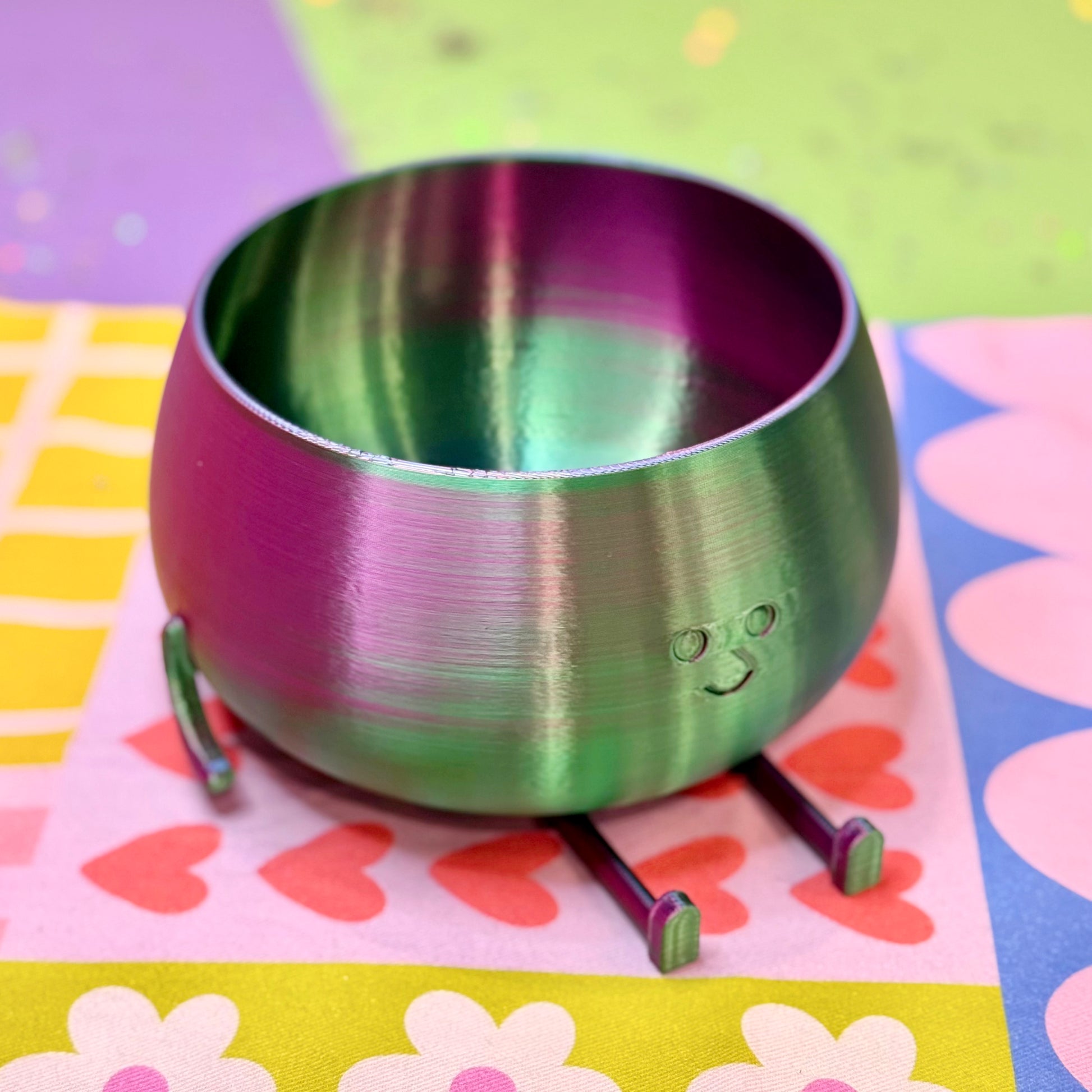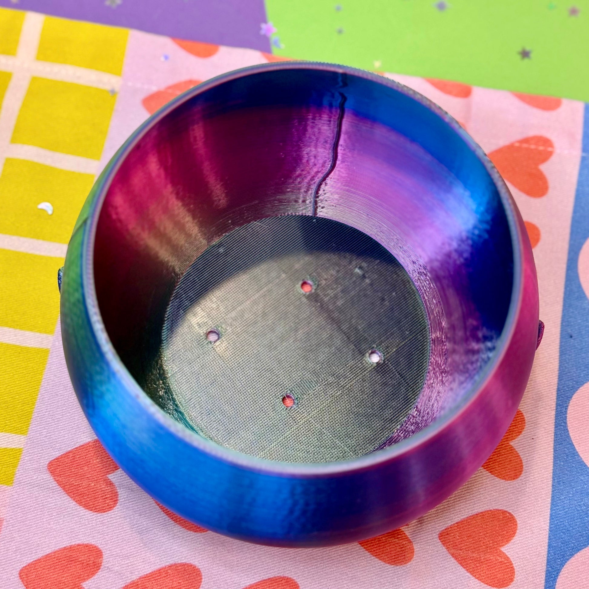 3D printed smiley guy planter made in Indianapolis • plant-based material • 4 drainage holes • purple blue green iridescent colors