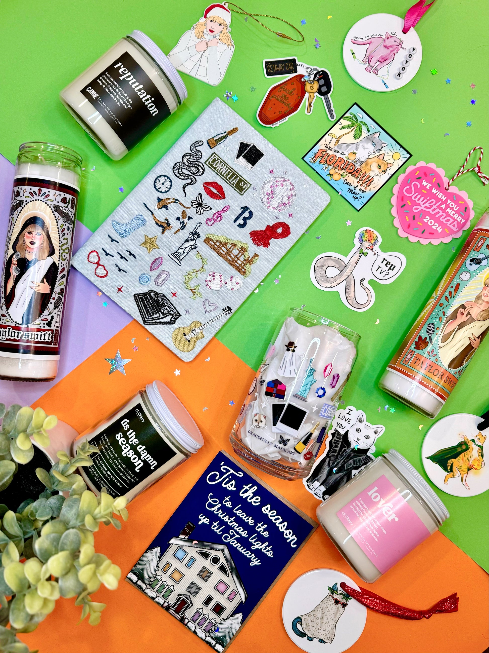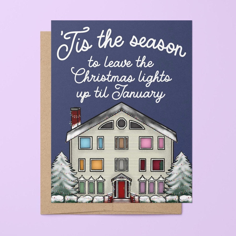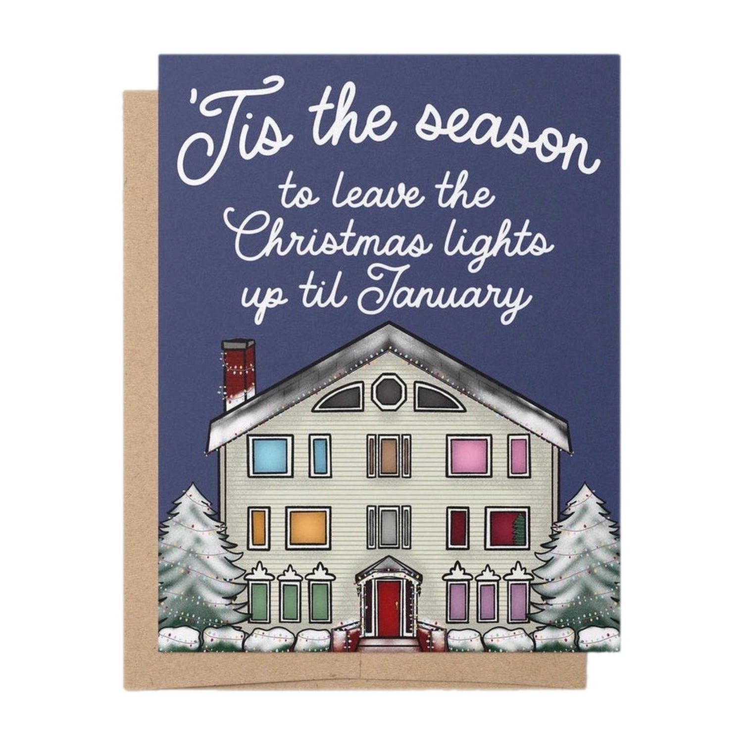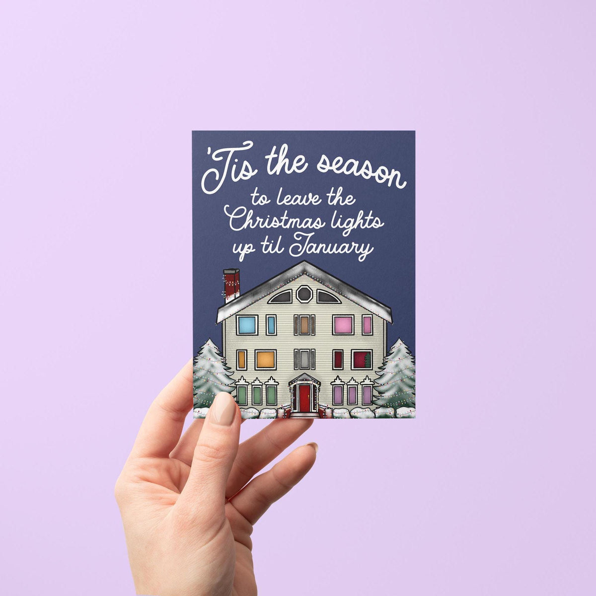 This Swiftie holiday card features an illustration of Taylor Swift’s Lover House decked out in Christmas lights and dusted with snow. The greeting reads "'Tis the season to leave the Christmas lights up till January."