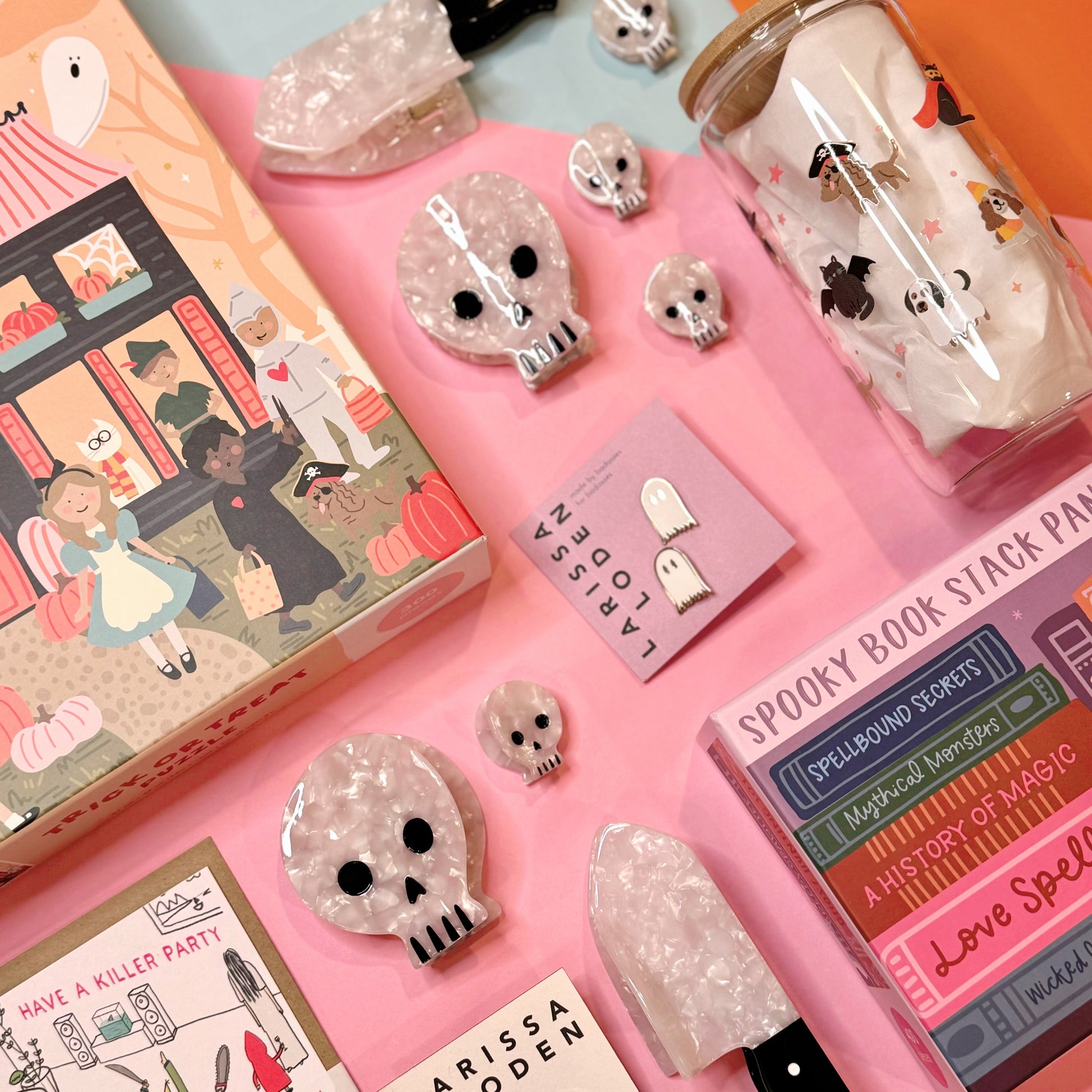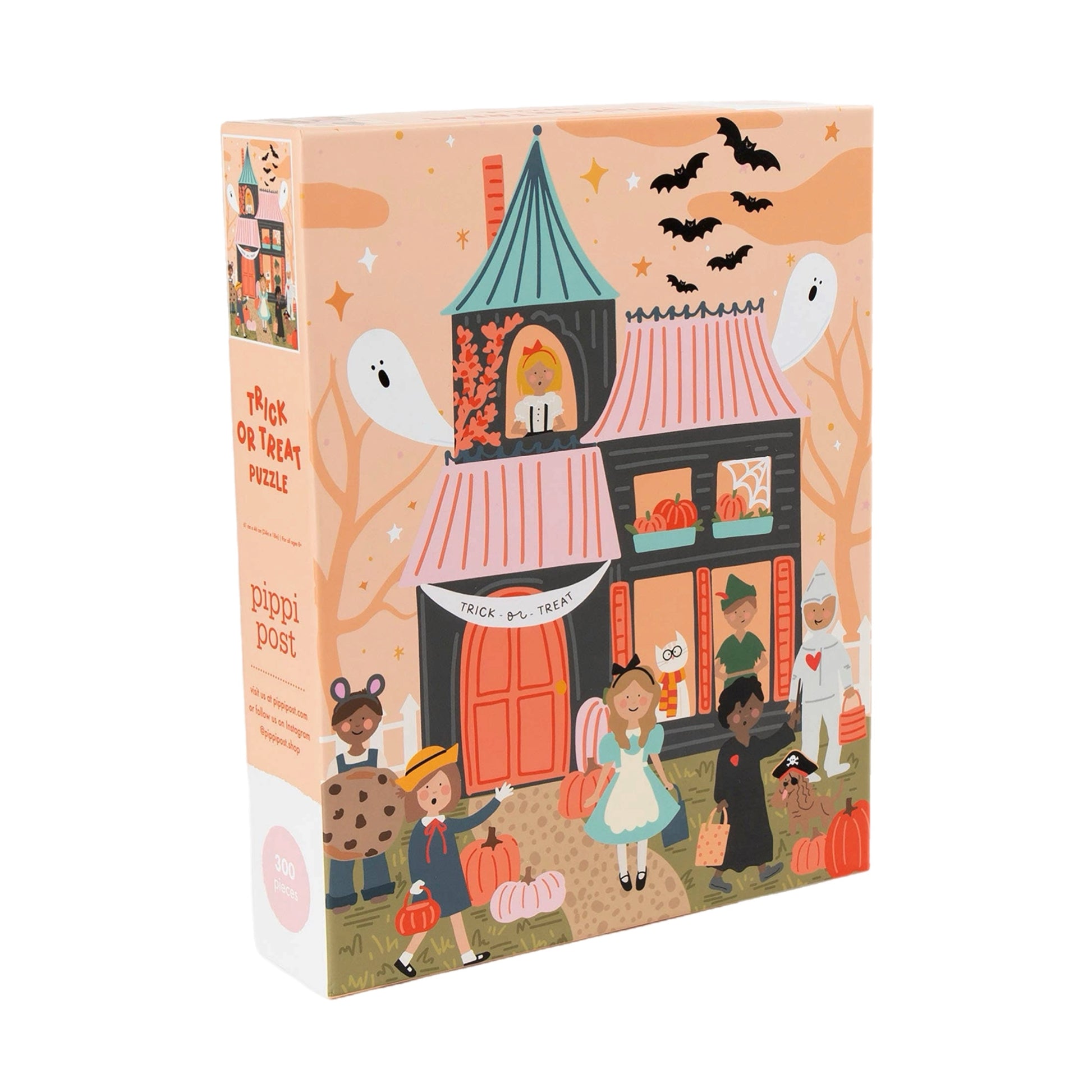 Featuring a charming hand-illustrated scene, this puzzle captures the joy of trick-or-treating with happy trick-or-treaters in costume, a spooky house, playful pumpkins, friendly ghosts, and flying bats