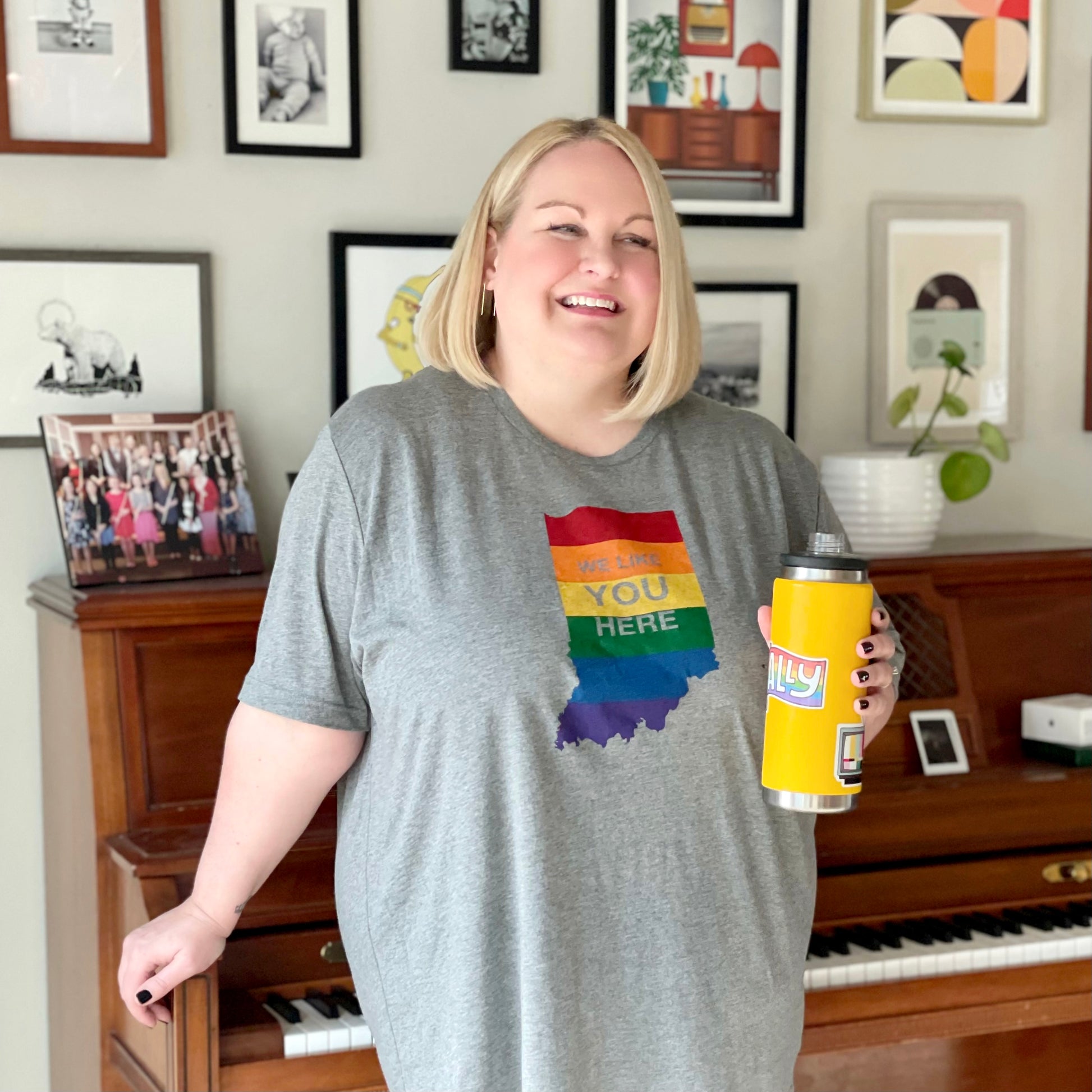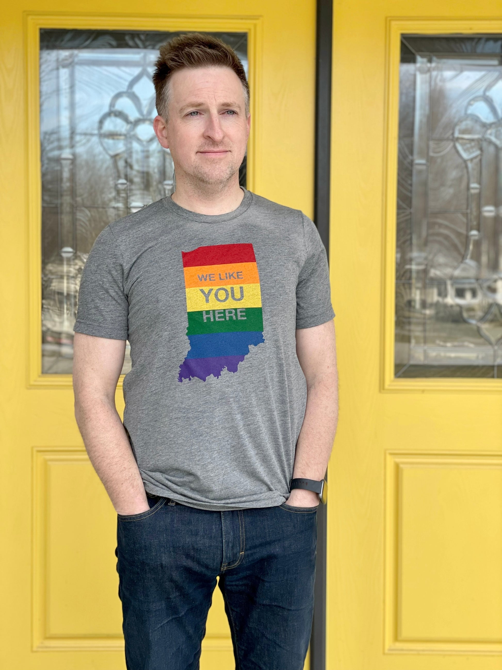 The Indiana Rainbow "We Like You Here" tee shirt is for those of us who love the state we live in and believe in equal love and support for all. Show your love for Indiana Pride with this stylish shirt! Printed locally in Indianapolis.